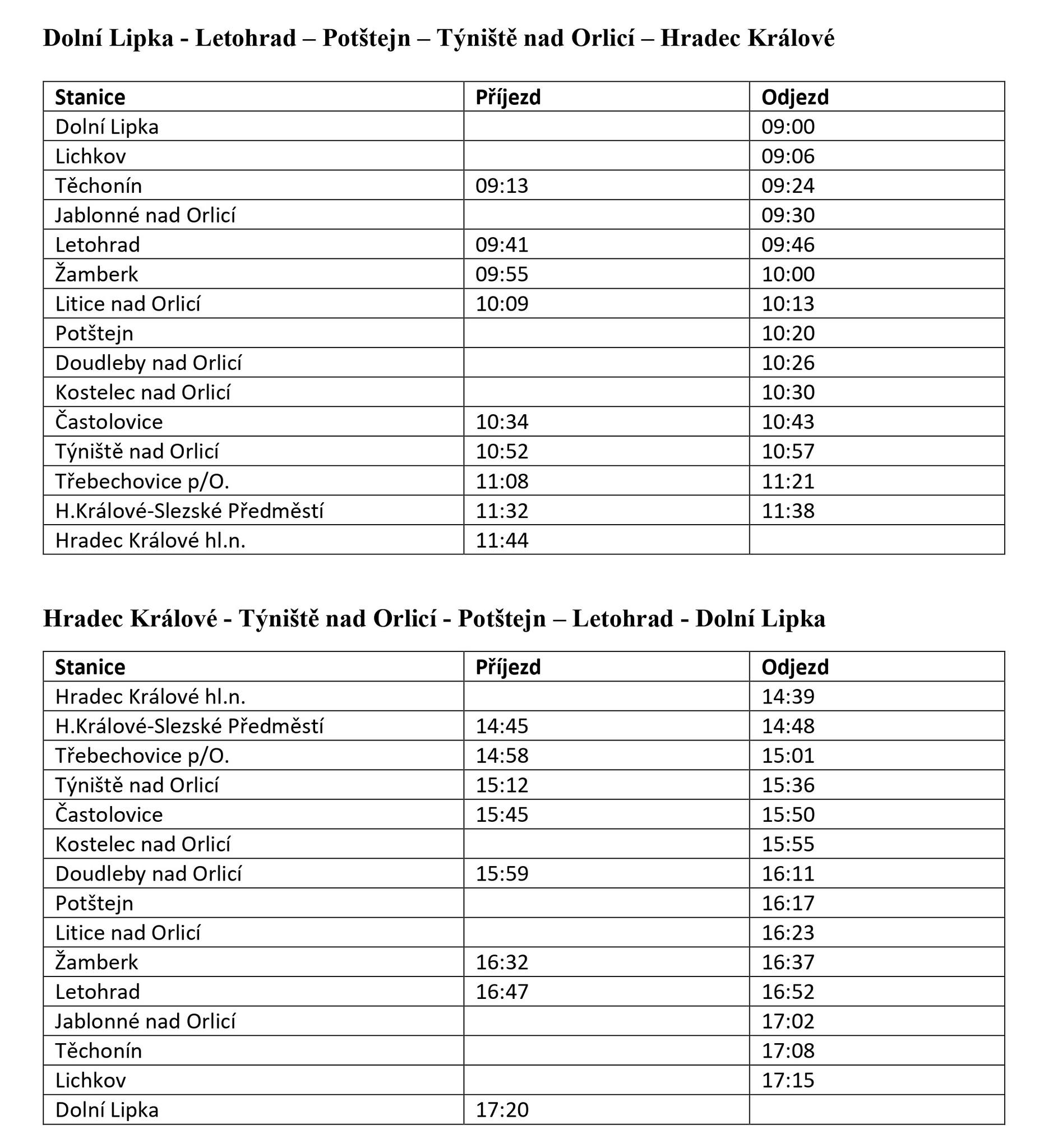 - Jízdní řád zvláštních parních vlaků po trase Dolní Lipka - Ústí nad Orlicí - Česká Třebová - Moravská Třebová - Chornice