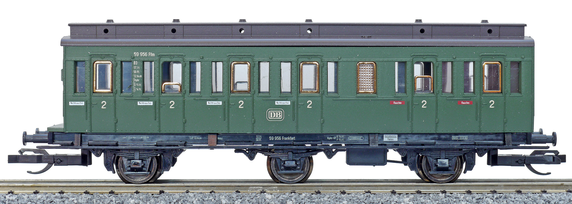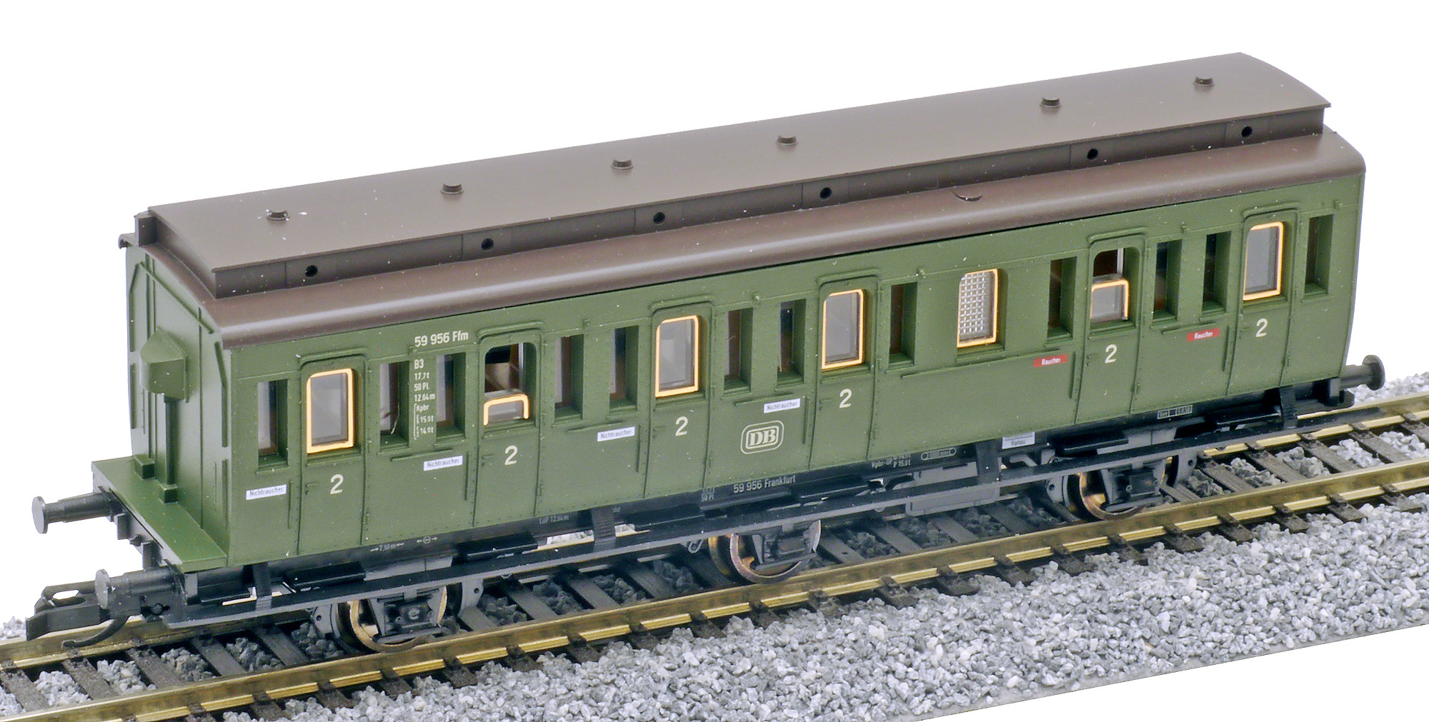 | oddílový osobní vůz zelený s černou střechou a brzdařskou budkou 2. tř. |