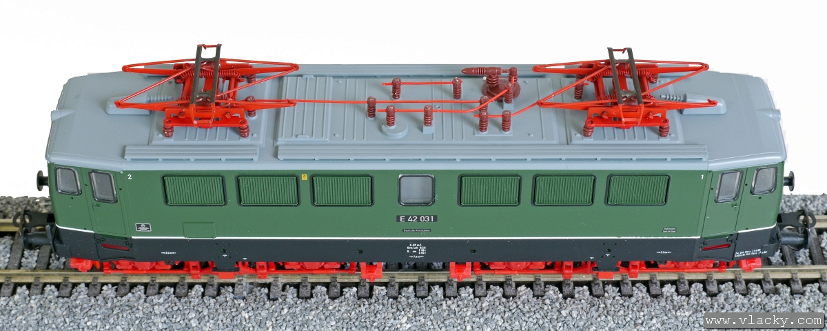 Popis   elektrická lokomotiva zelená s černým rámem, šedou střechou a červenými podvozky