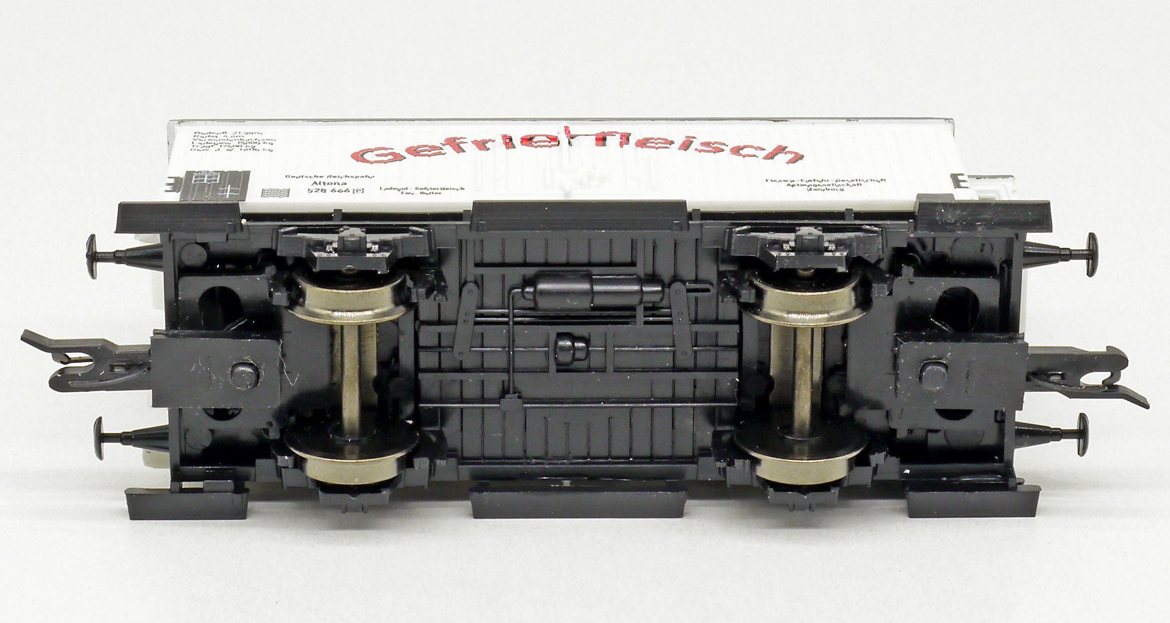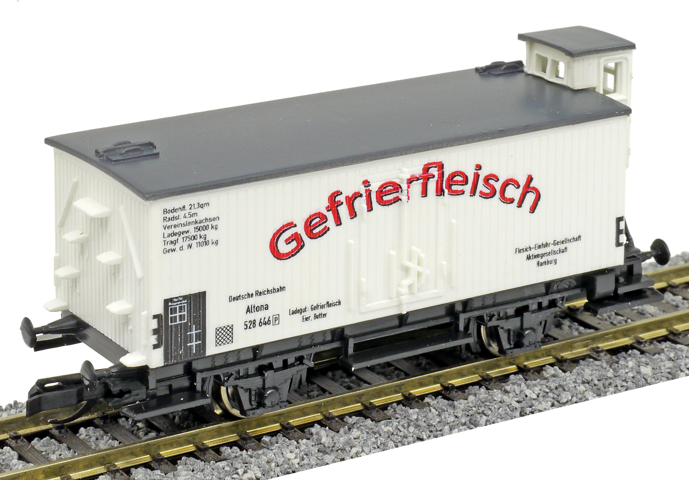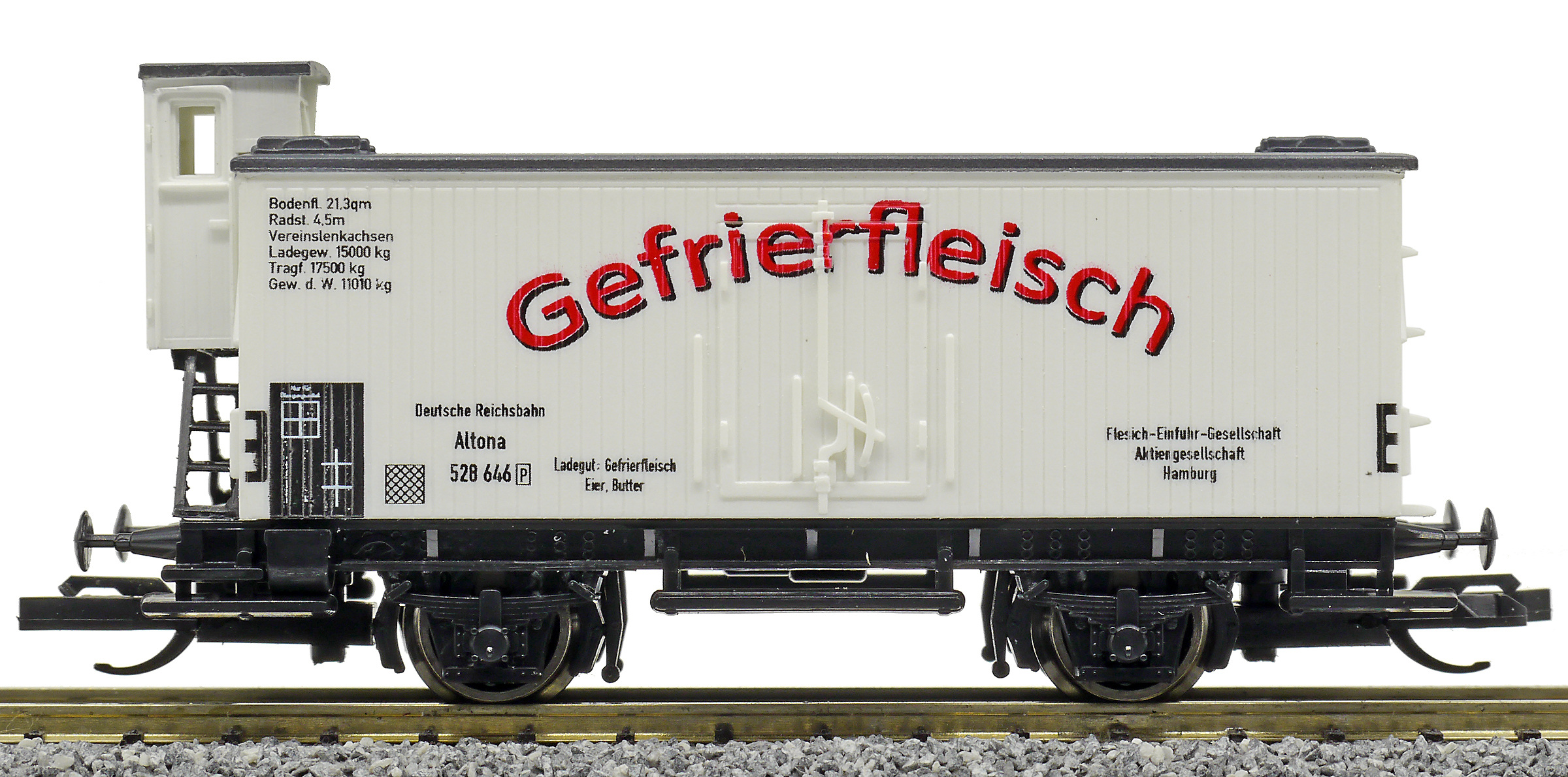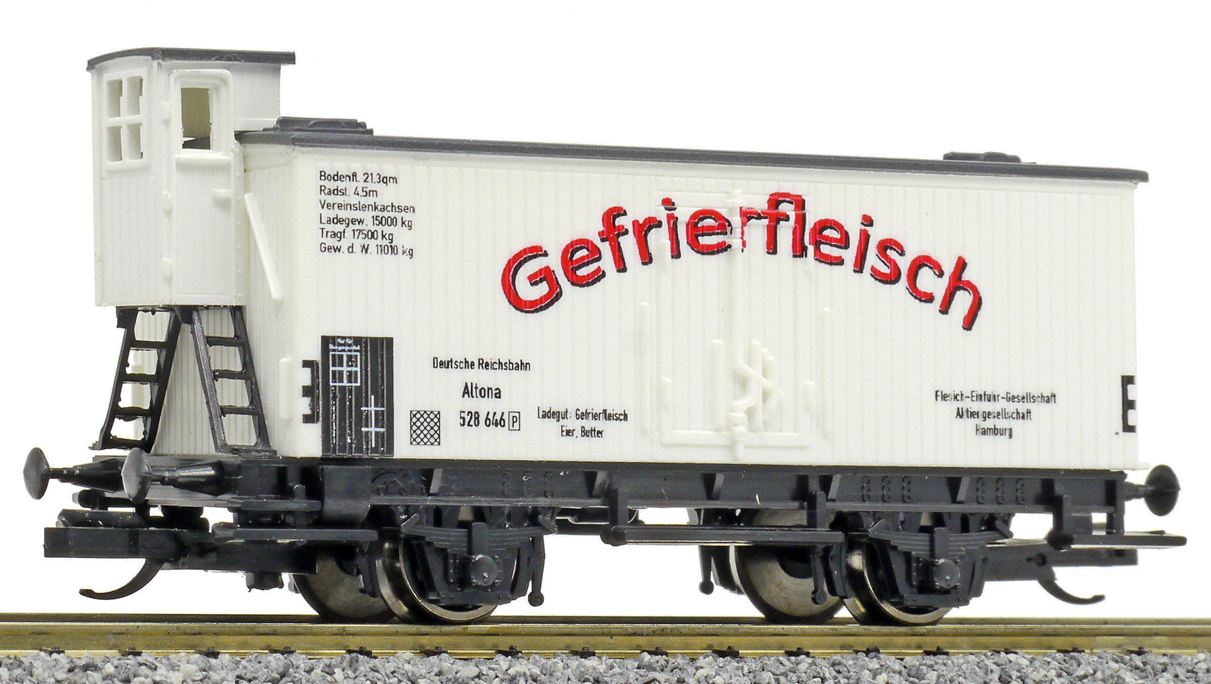 | nákladní chladící vůz bílý s šedou střechou a brzdařskou budkou „Gefrierfleisch“ |