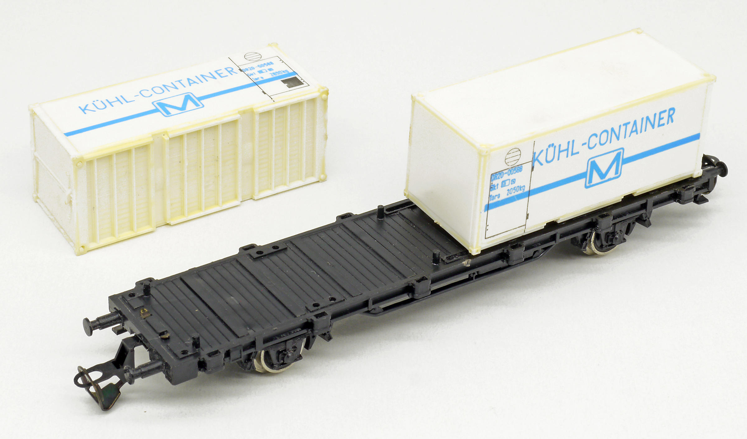 | nákladní plošinový vůz černý se dvěma 20' kontejnery „KÜHL-CONTAINER“ |