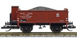 | otevřený nákladní vůz červenohnědý s brzdařskou budkou ložený uhlím |