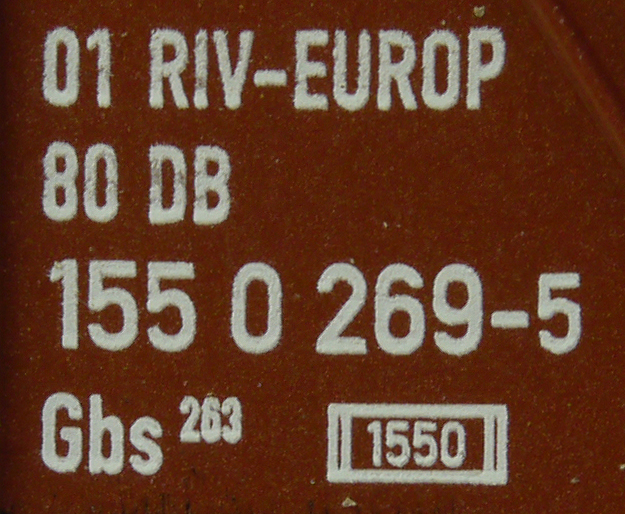 | • 01 80 155 0 269-5 | → | nákladní, nezávislé nápravy, pevný rozchod, ve vlastnictví železniční správy, RIV, EUROP/IF |
