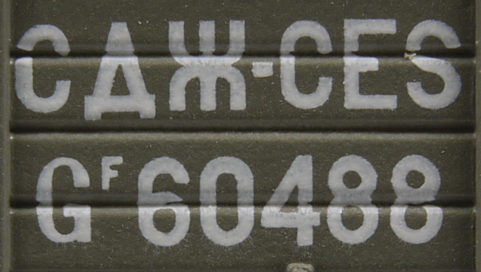 | krytý nákladní vůz zelenošedý s černou střechou a s brzdařskou budkou |