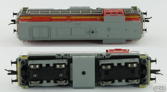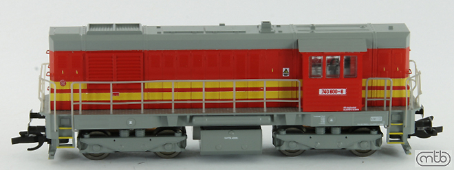 Popis   dieselová lokomotiva červená se žlutými proužky, šedá střecha, rám a pojezd