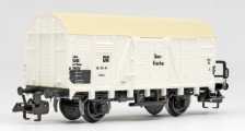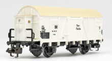 nákladní chladící vůz bílý s krémovou střechou a s brzdařskou budkou na přepravu ryb „Seefische“