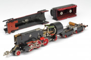 | parní lokomotiva černá s červenými koly a rozvodem, kouřové plechy |