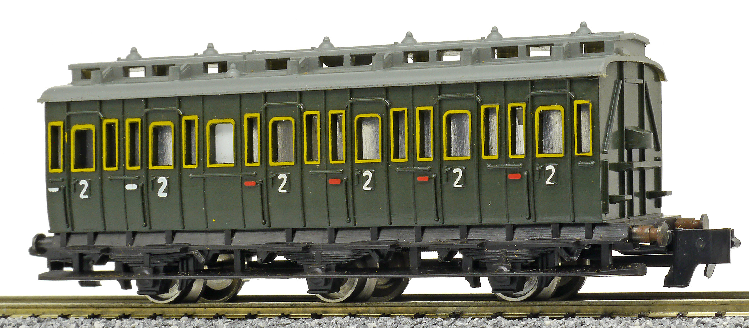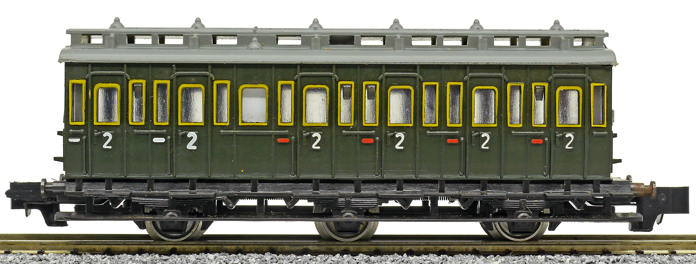 oddílový osobní vůz zelený s šedou střechou 2. tř.