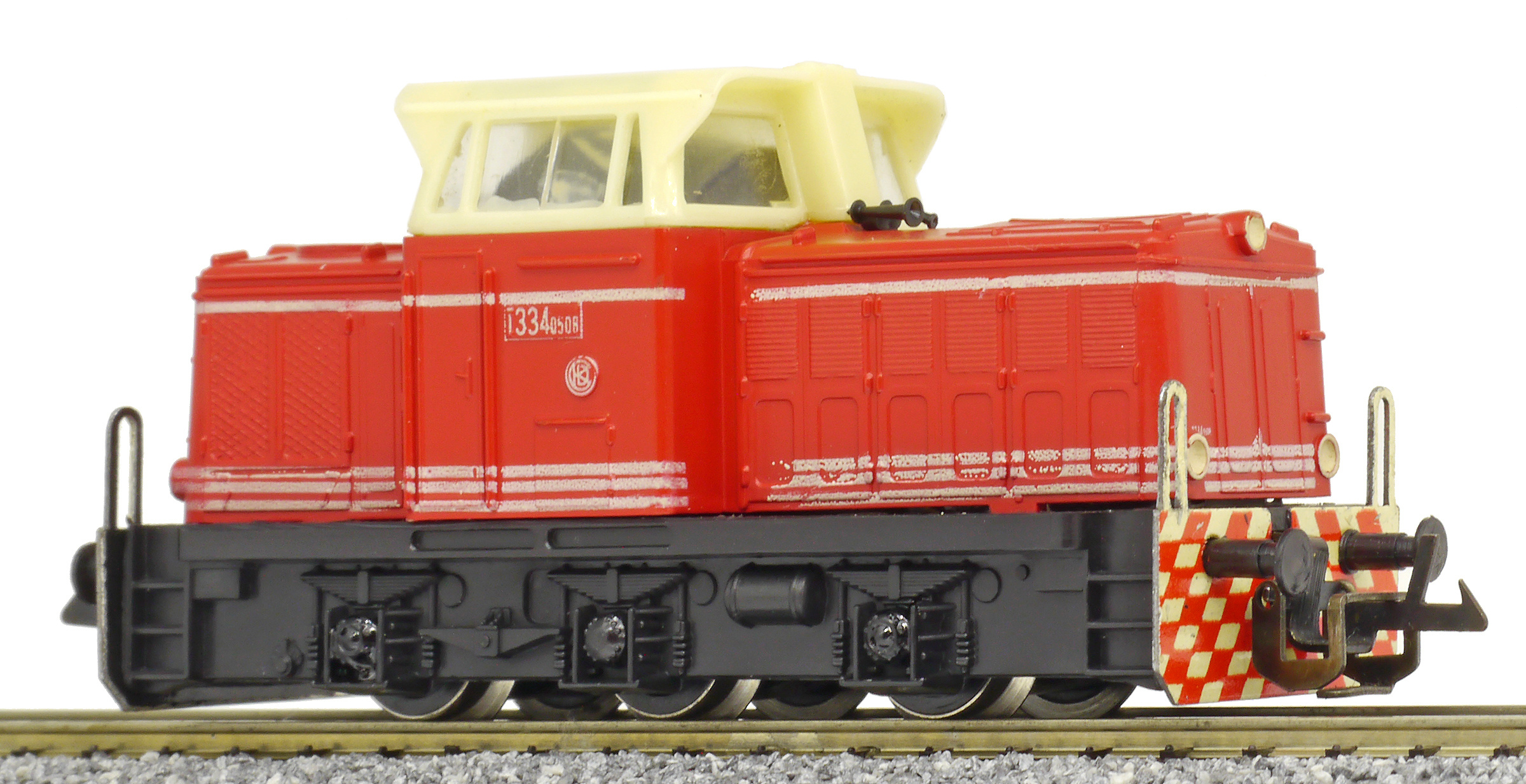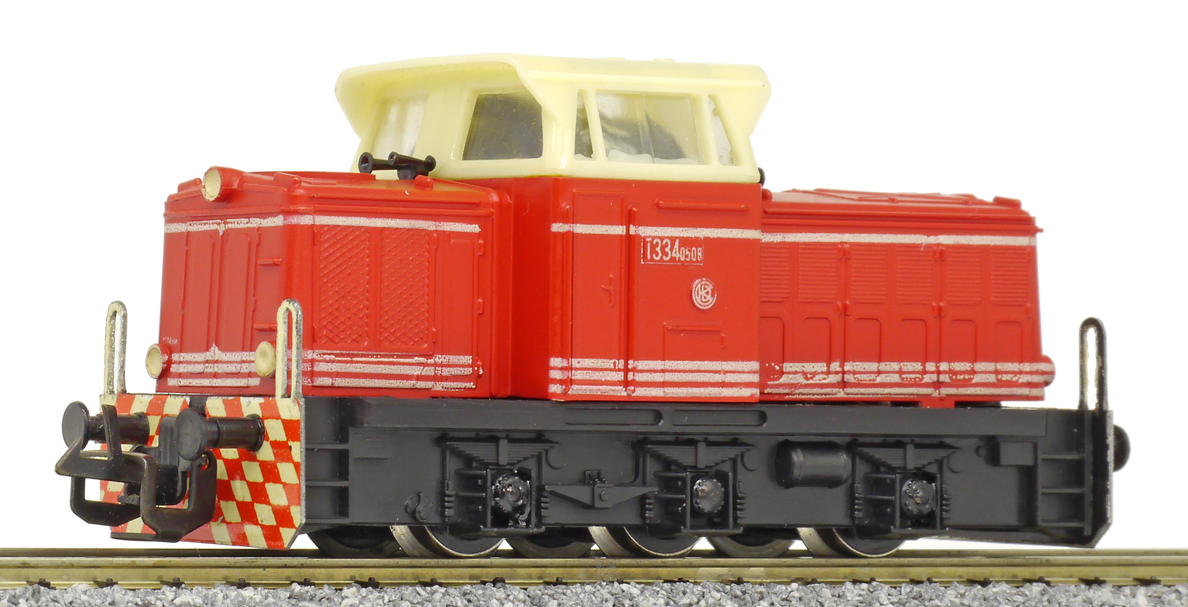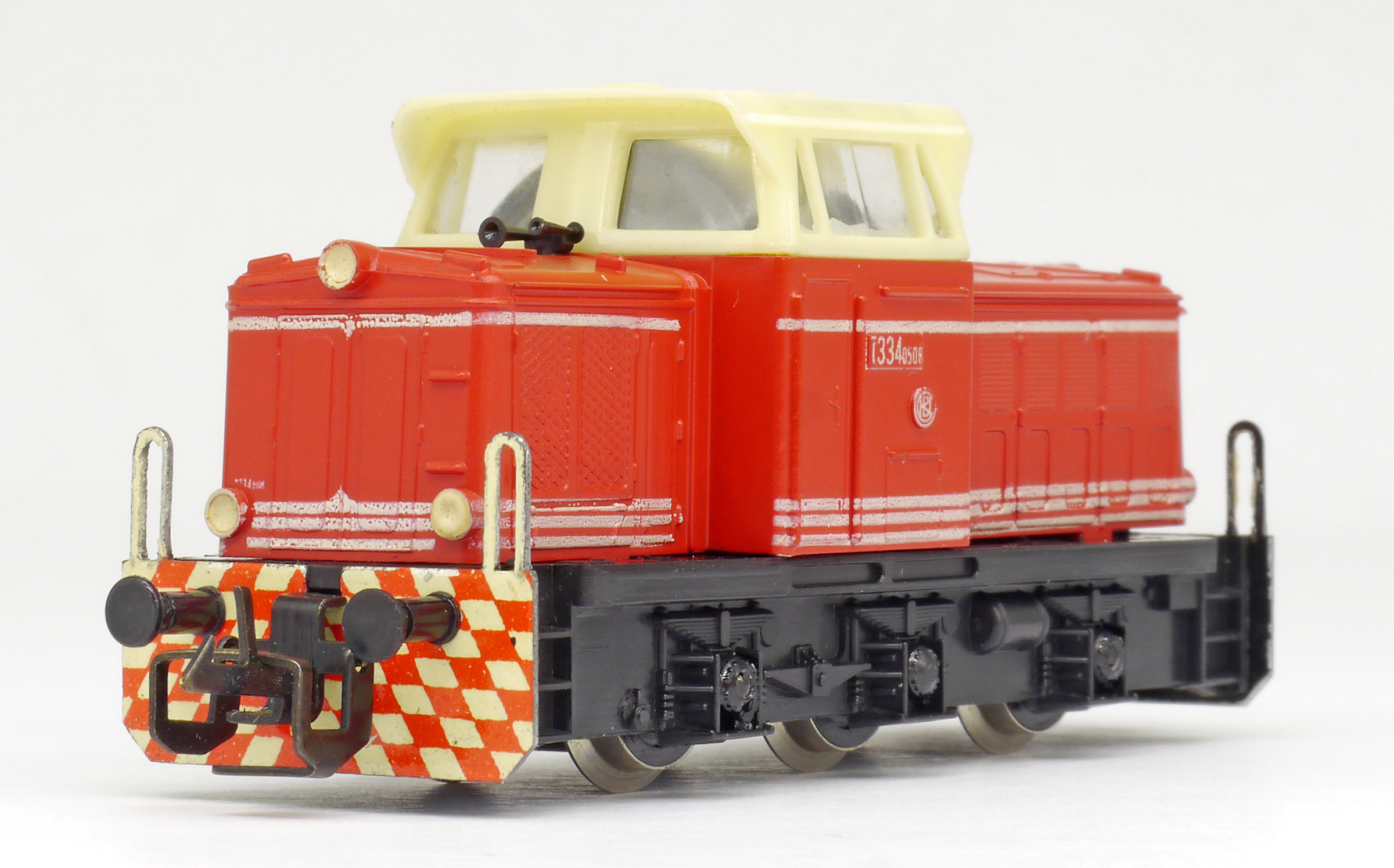 | dieselová lokomotiva červená s bílými proužky, krémová budka, černý rám a pojezd |