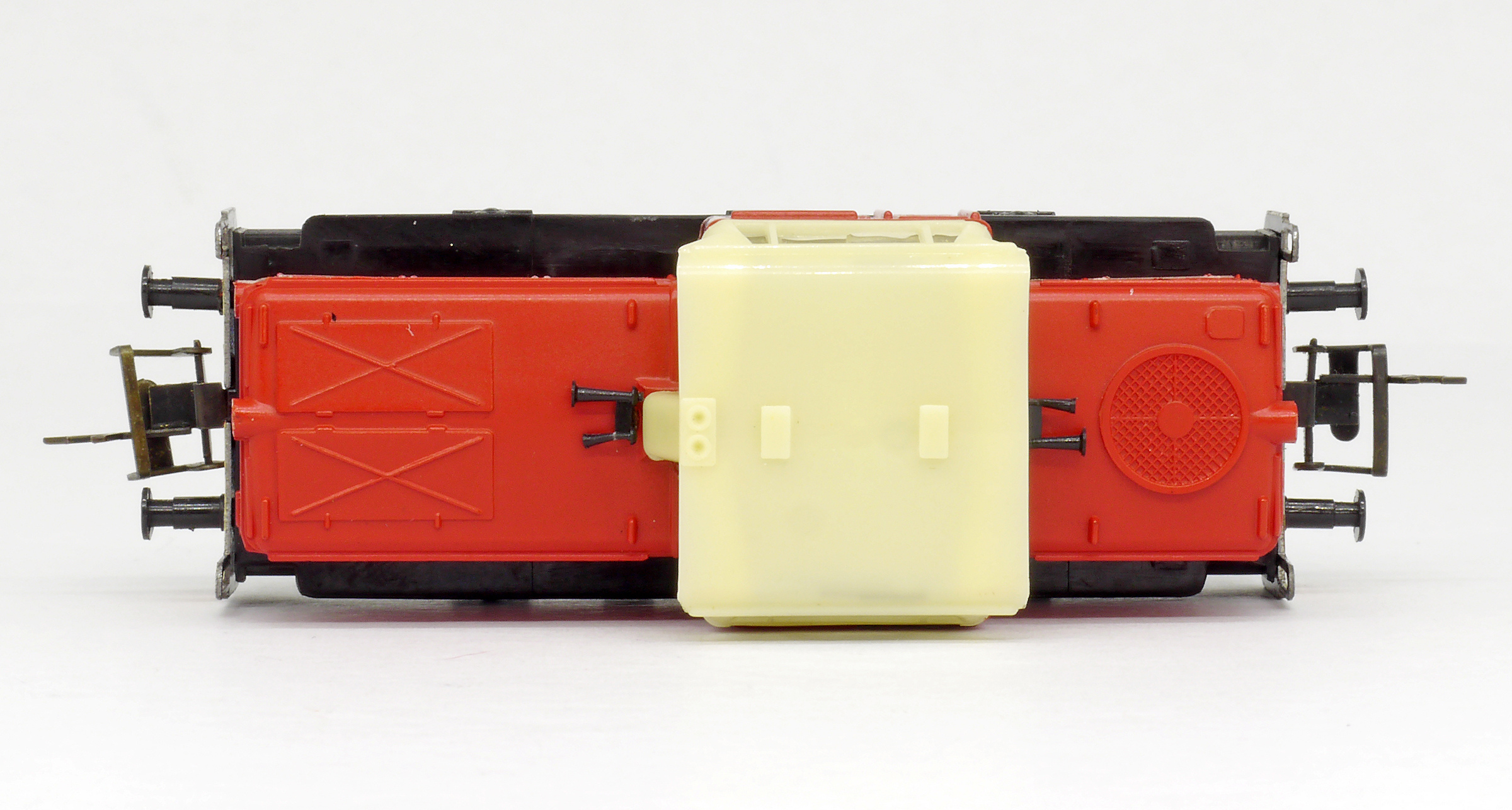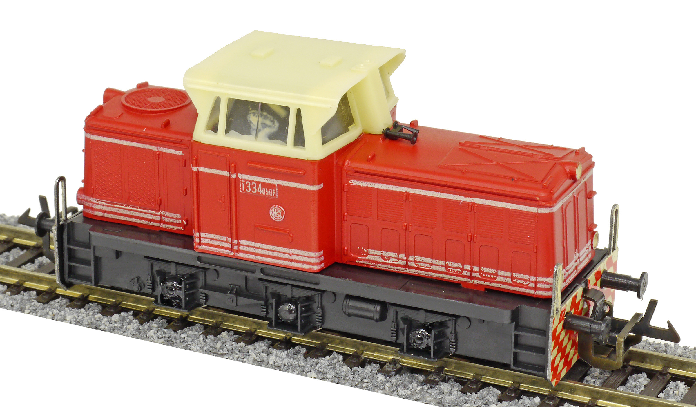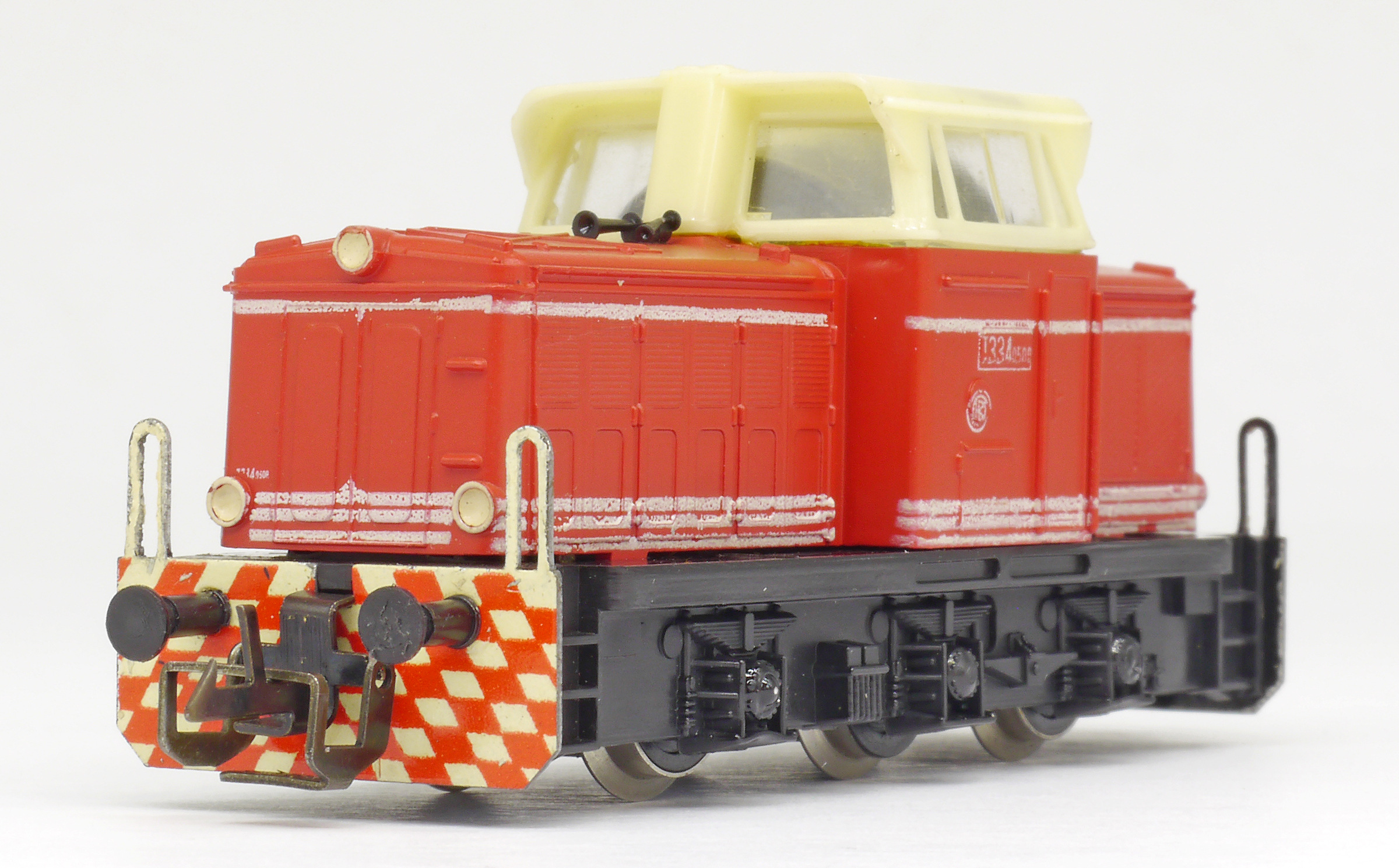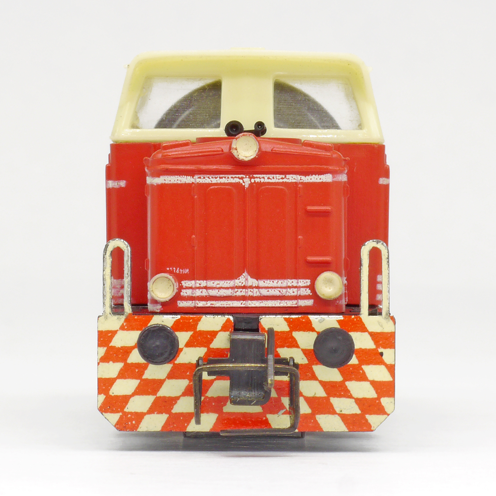 | dieselová lokomotiva červená s bílými proužky, krémová budka, černý rám a pojezd |