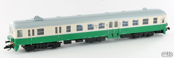 | motorový vůz zelený-slonová kost s šedou střechou, výstražný pruh na čelech |