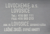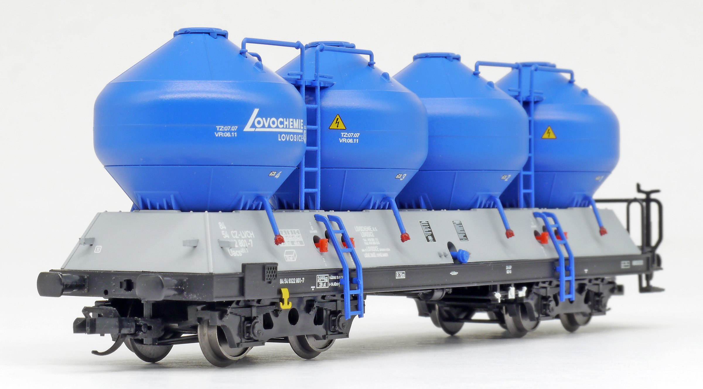 | nákladní samovýsypný vůz šedý s modrými nádobami a s logem „Lovochemie“ |