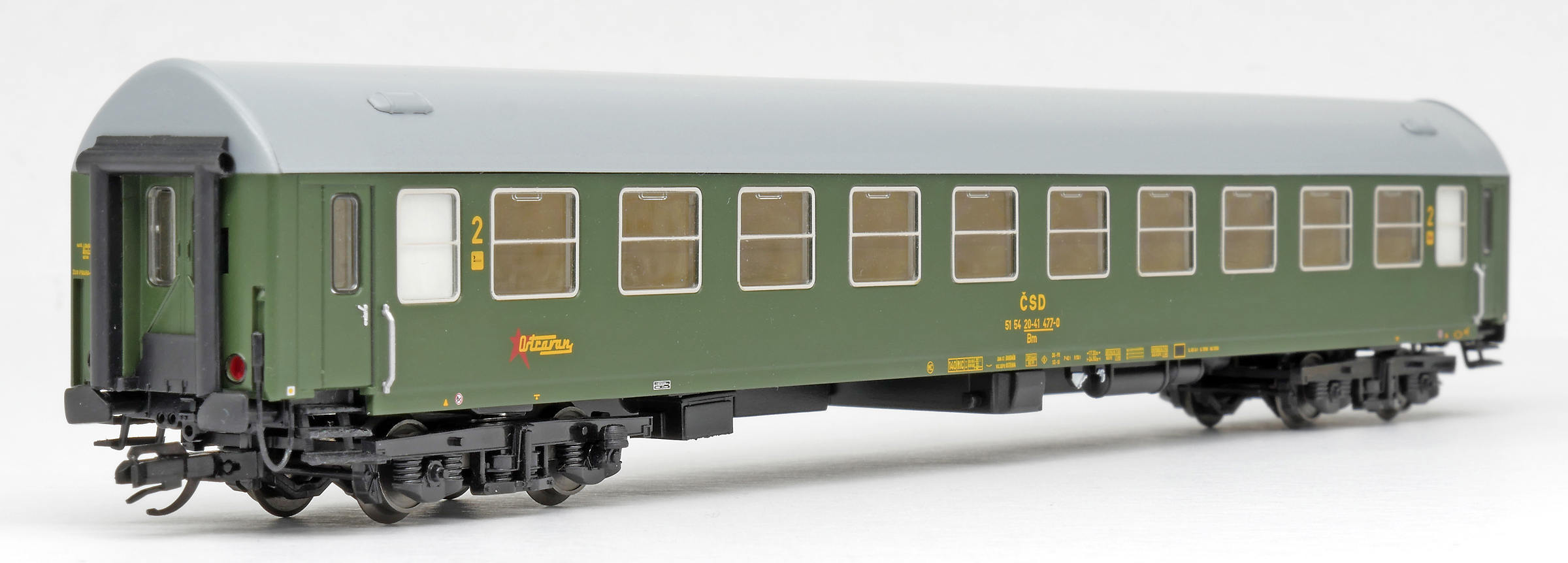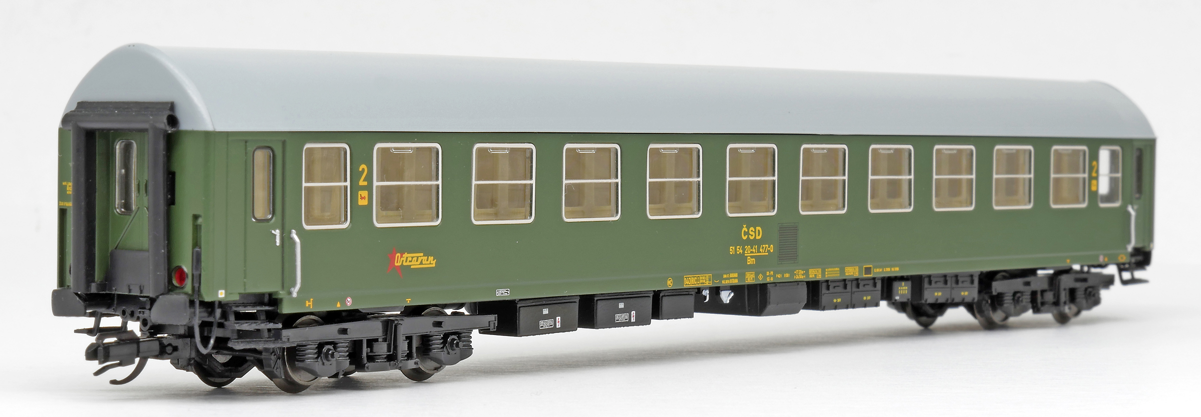 | rychlíkový vůz zelený s šedou střechou 2. tř. „Ostravan“ |