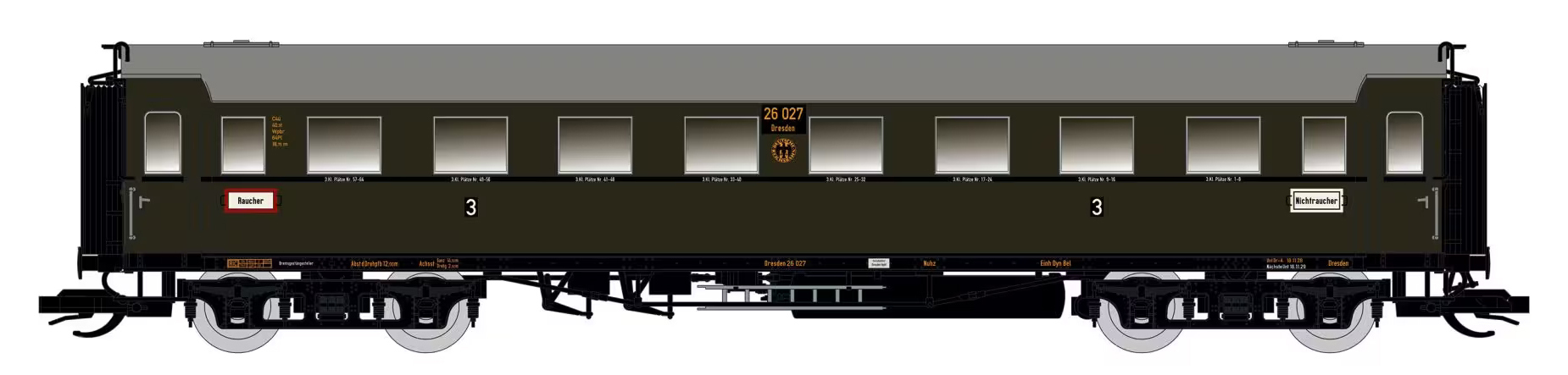 oddílový osobní vůz tmavě zelený s šedou střechou 3. tř.