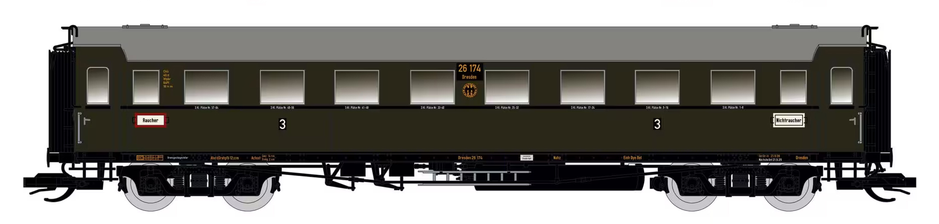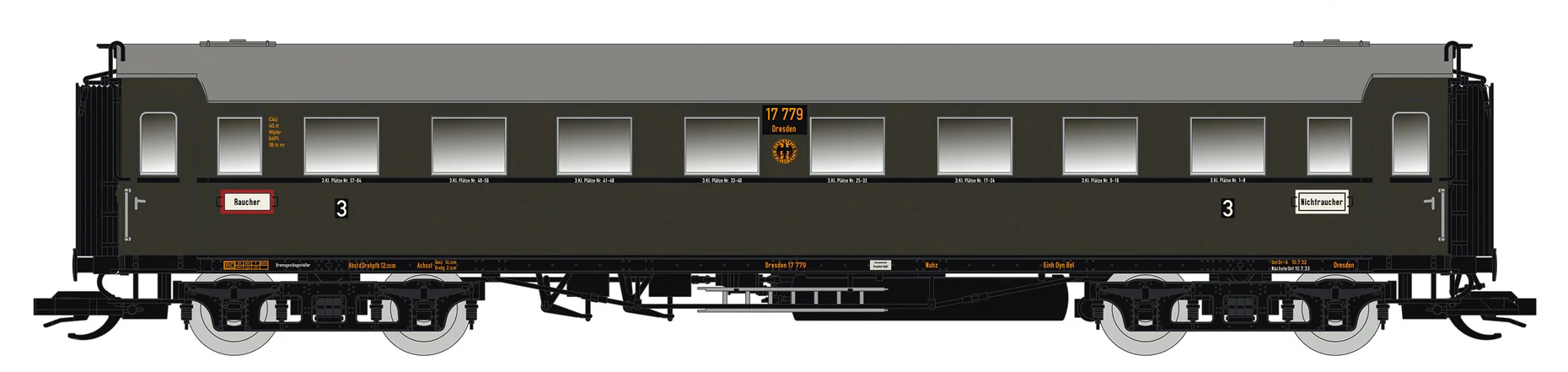 oddílový osobní vůz tmavě zelený s šedou střechou 3. tř.