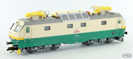 | elektrická lokomotiva zelená-slonová kost s výstražným pruhem na čelech |