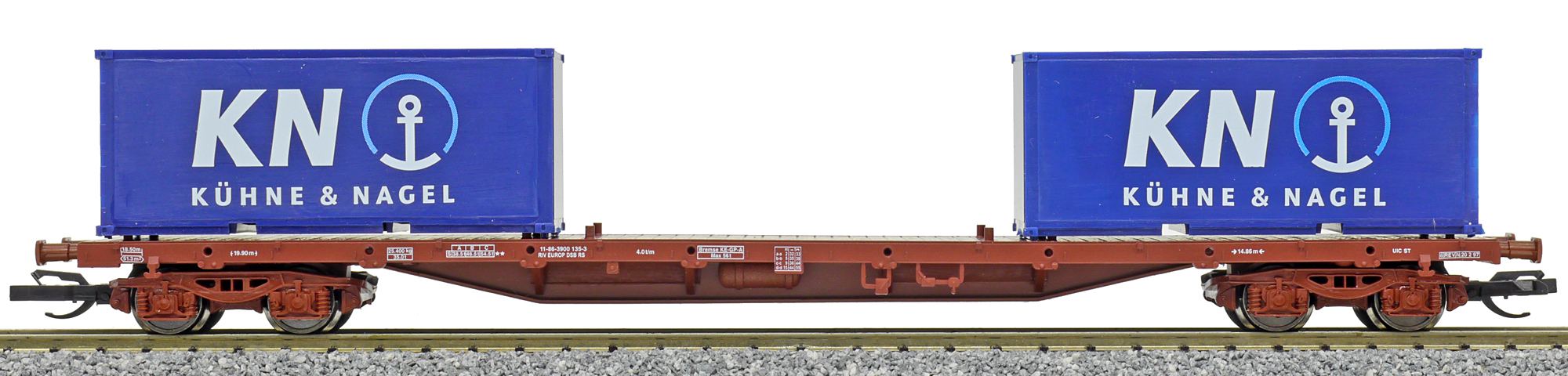| nákladní plošinový vůz červenohnědý se dvěma kontejnery 20' „Kuhne & Nagel“ |