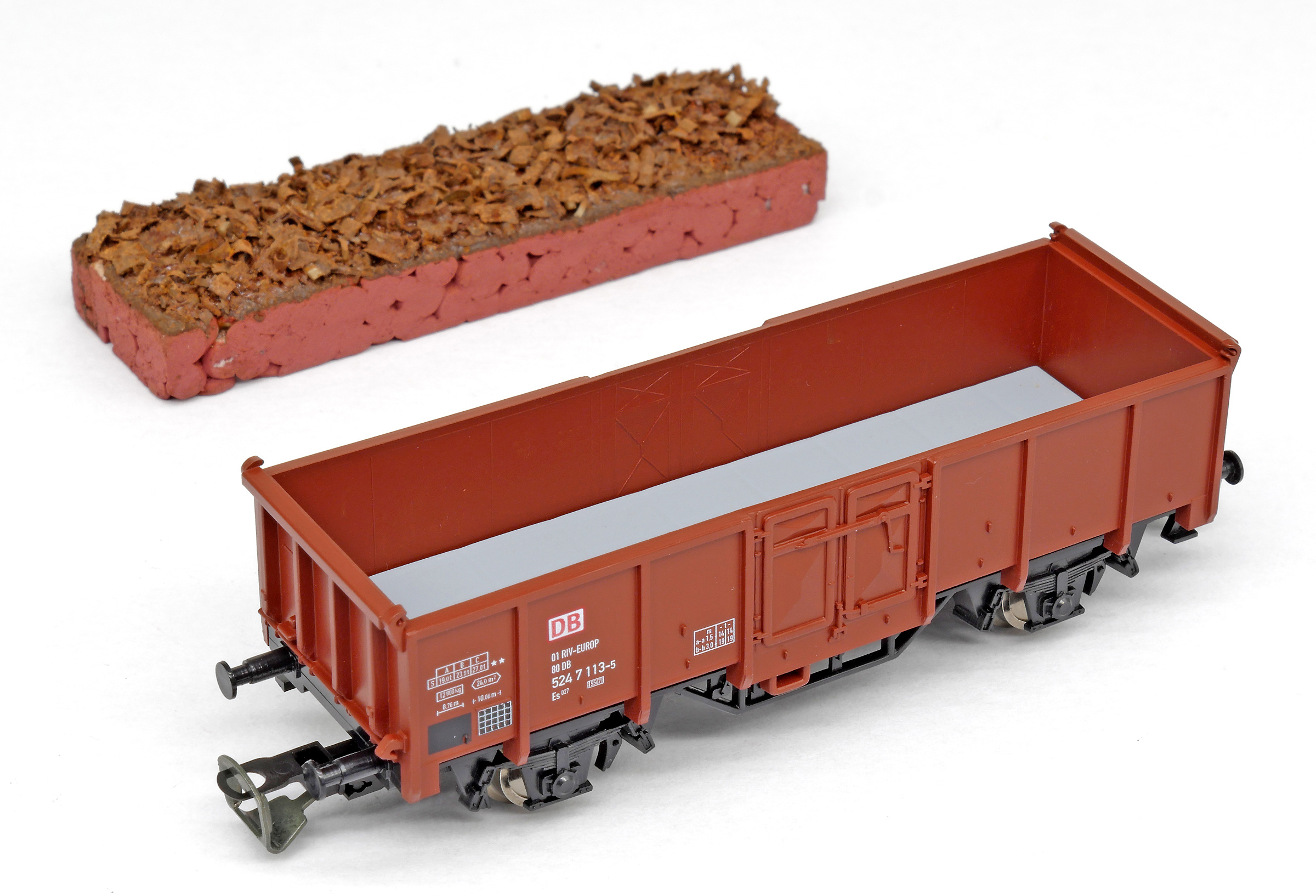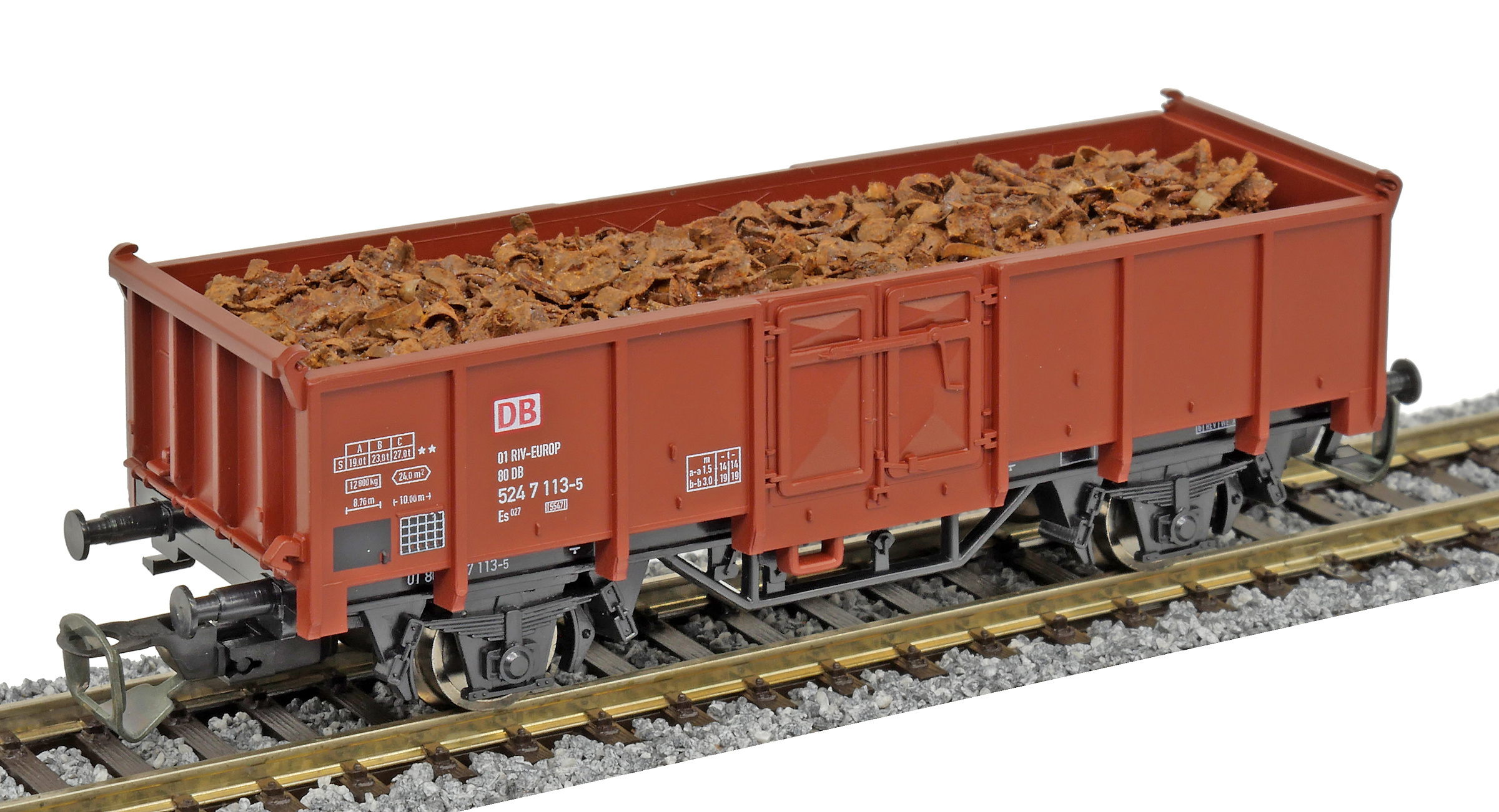 | otevřený nákladní vůz červenohnědý s nákladem šrotu |