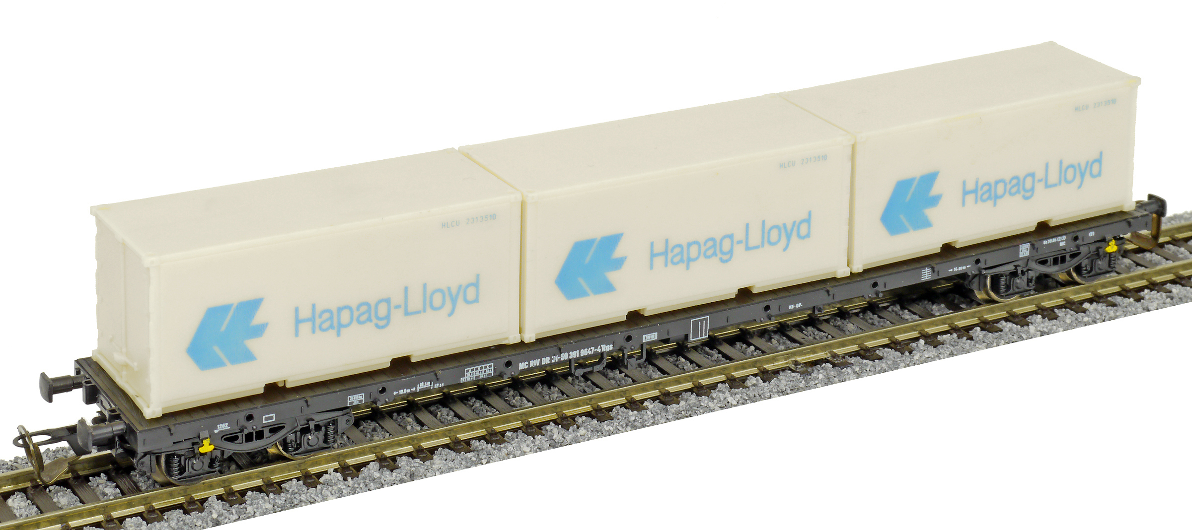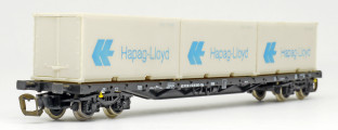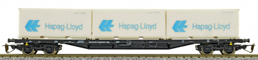 | nákladní plošinový vůz černý se třemi kontejnery 20' „Hapag-Lloyd“ |
