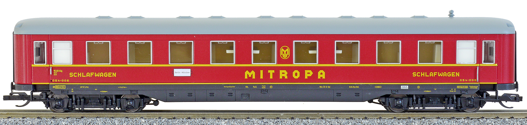 | lůžkový vůz červený s šedou střechou „Mitropa“ |