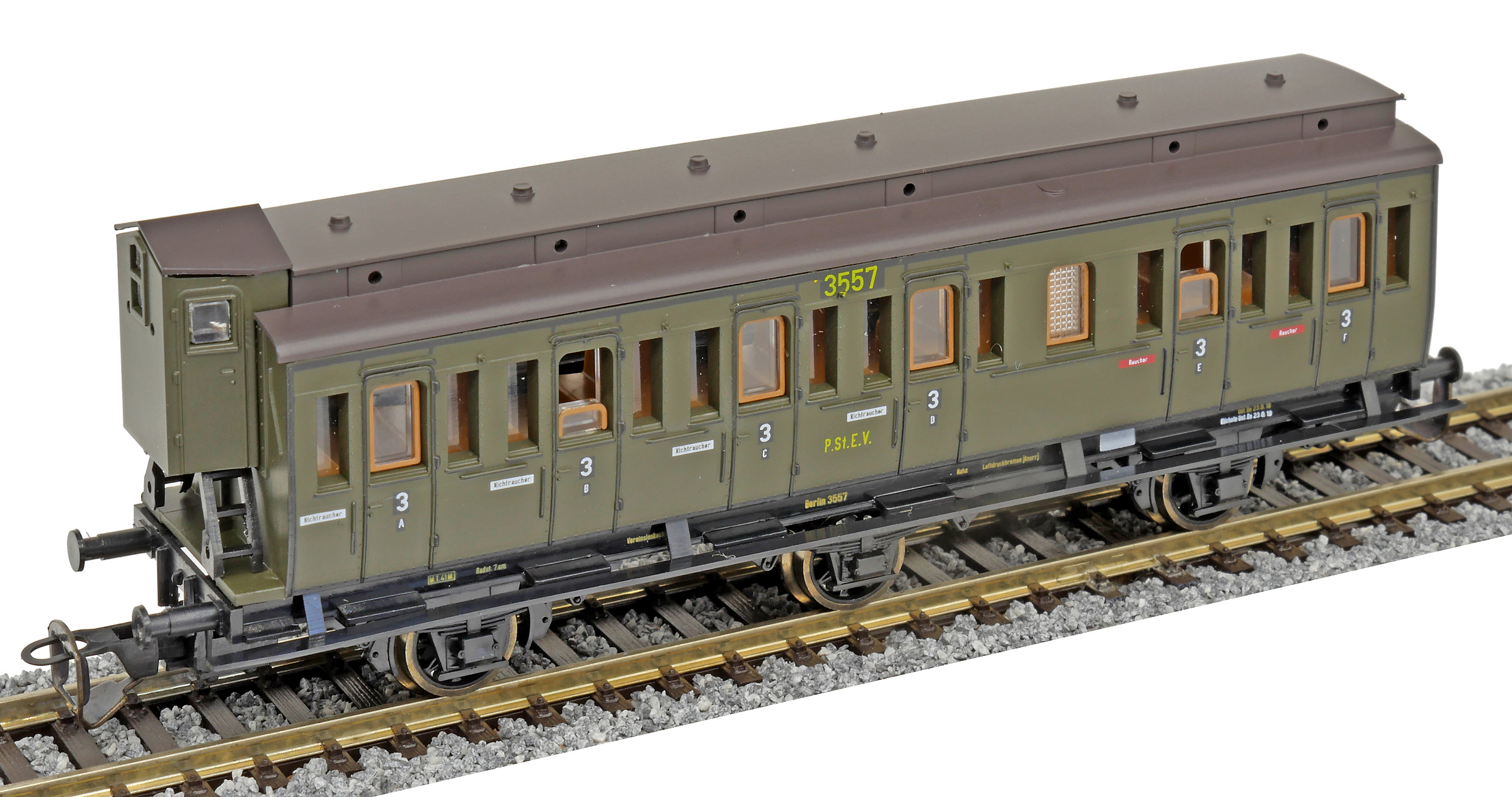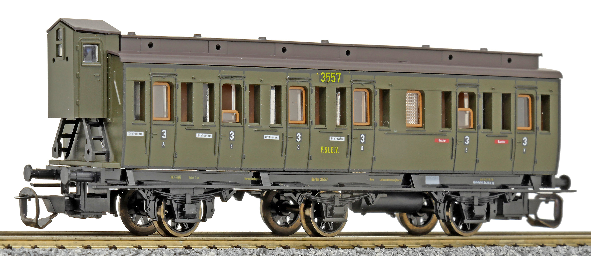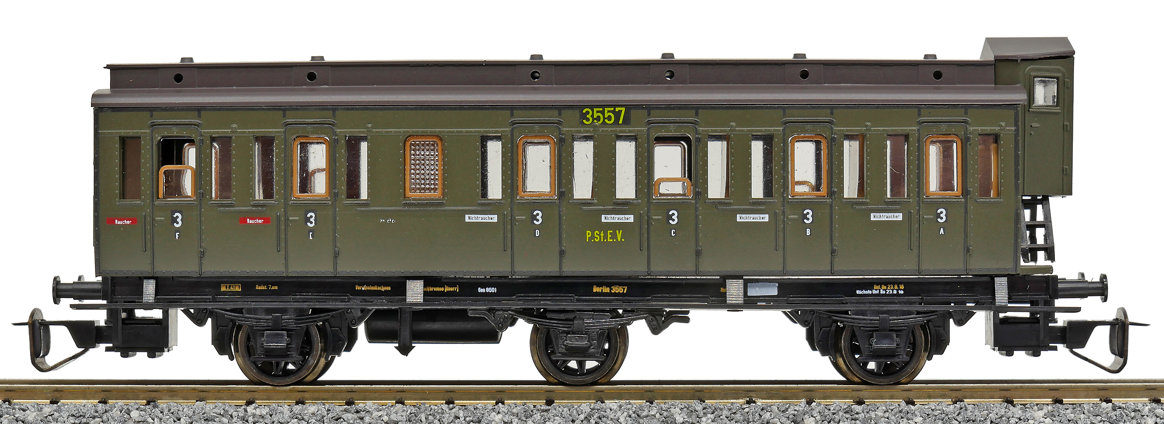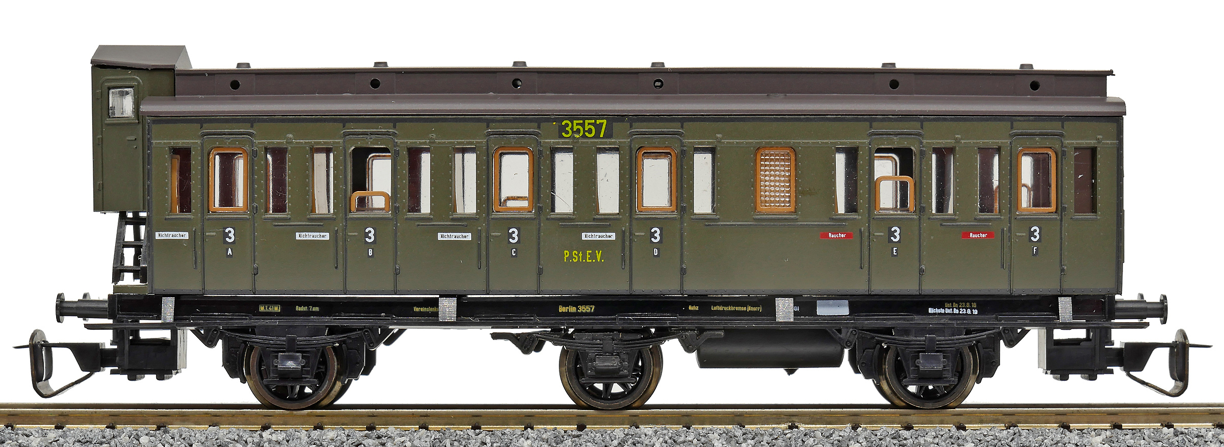 Popis   oddílový osobní vůz zelený s černou střechou s brzdařskou budkou 3. tř. C3 pr 11