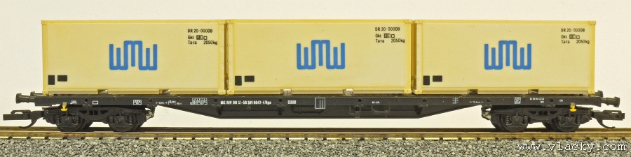 | nákladní plošinový vůz černý se třemi kontejnery 20' „WMW“ |