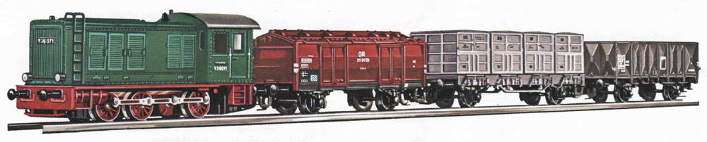 | set dieselové lokomotivy V 36 a tří nákladních vozů |