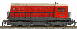 dieselová lokomotiva červená s krémovou střechou a černým pojezdem
