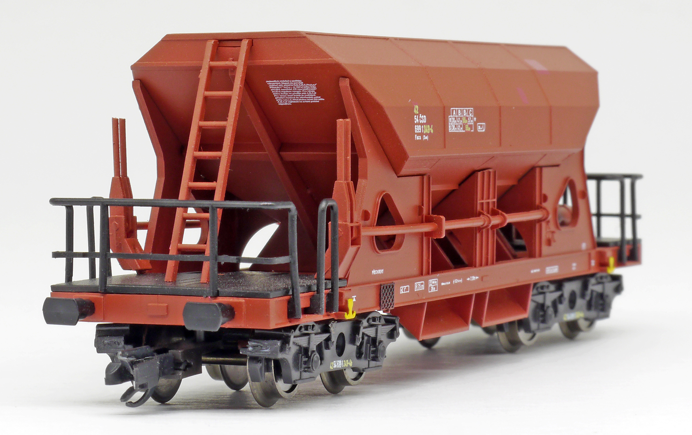 | nákladní samovýsypný vůz červenohnědý s opravnými fleky, černé plošinky |