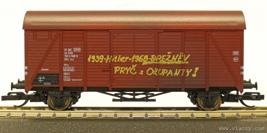 | krytý nákladní vůz červenohnědý s šedou střechou „1968 okupace ČSSR” |