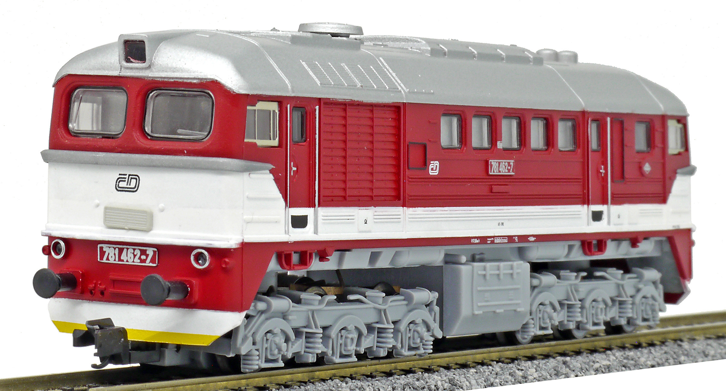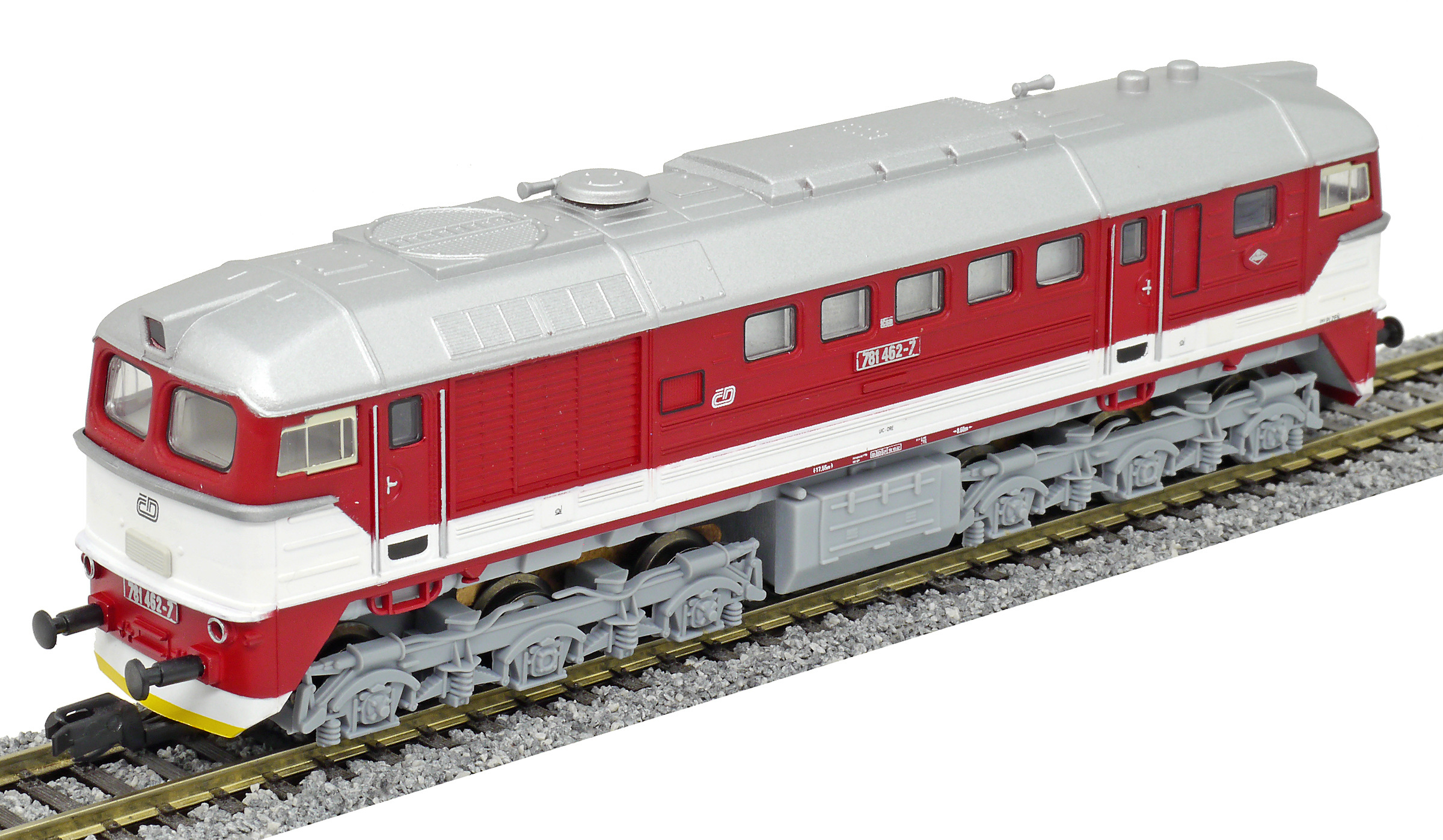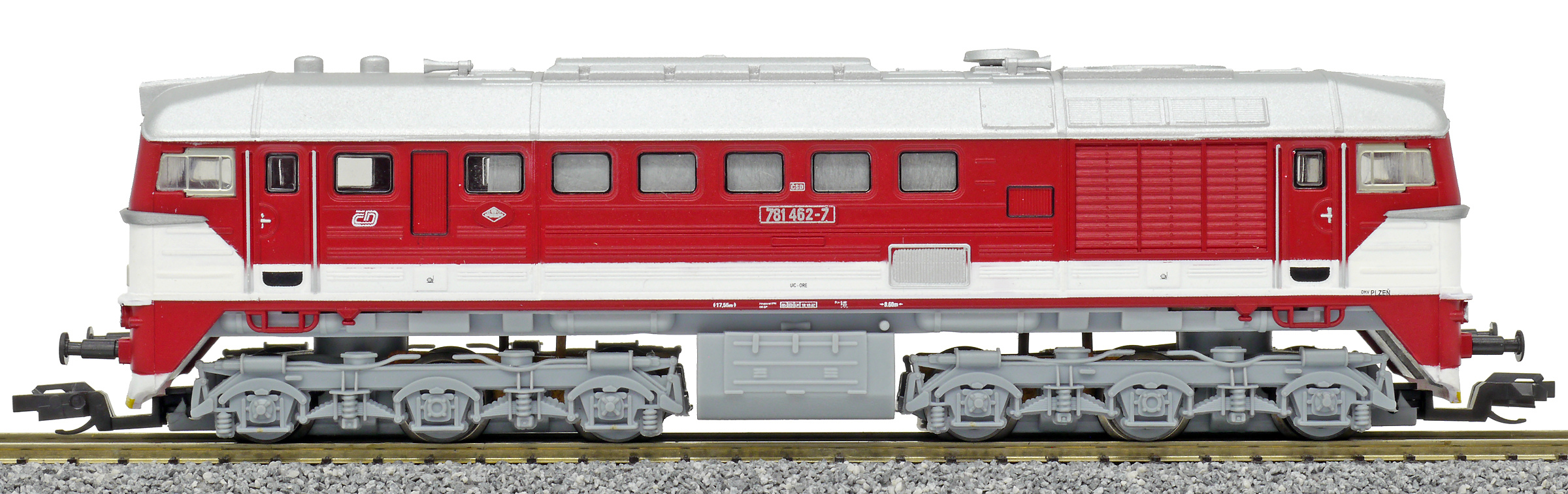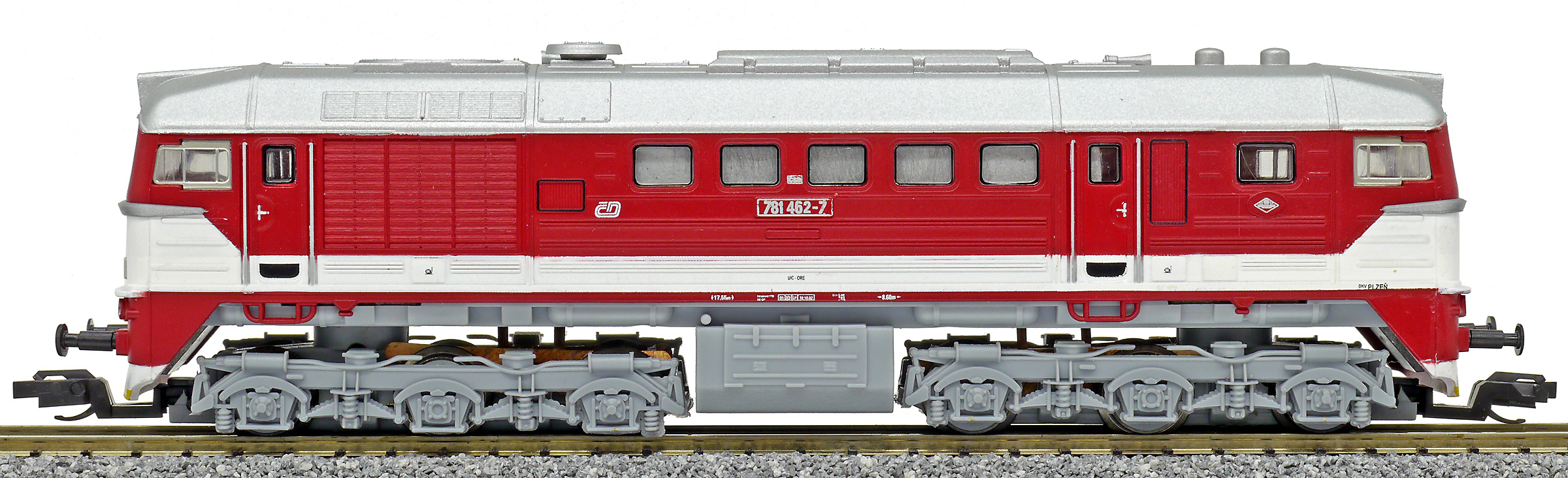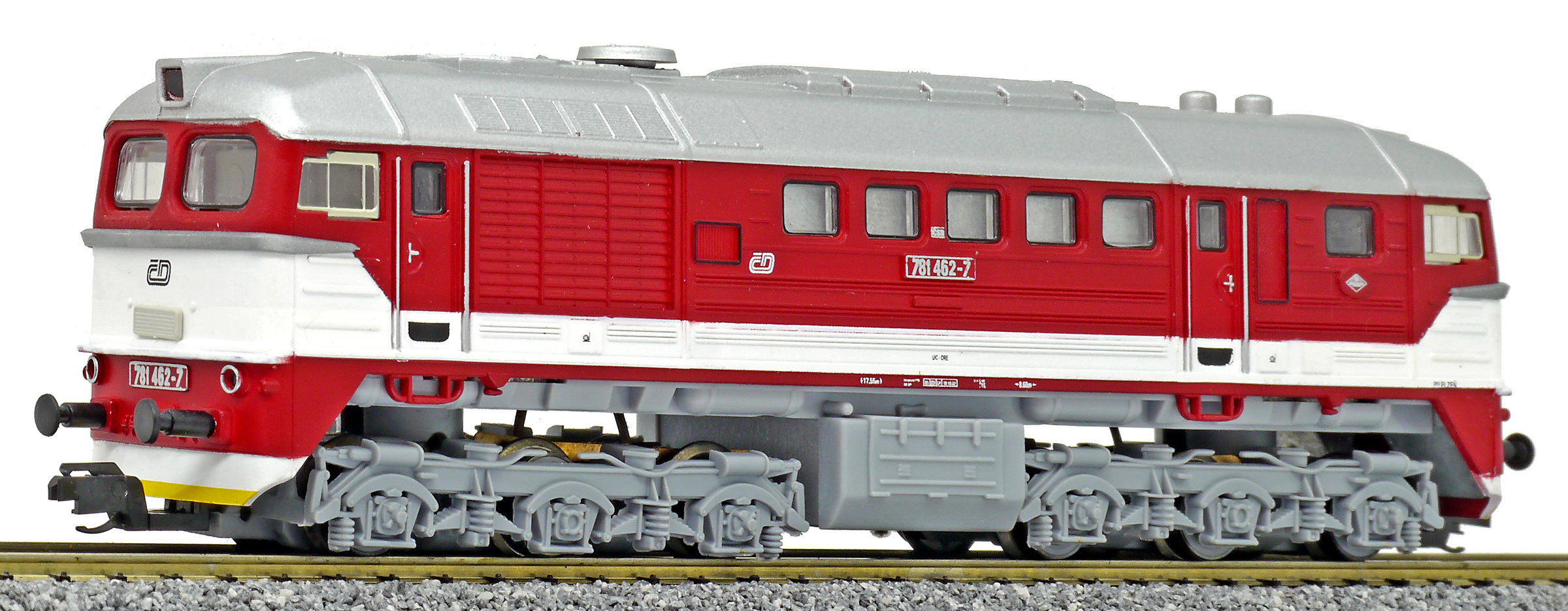 Popis   dieselová lokomotiva červená s bílým pásem, stříbrnou střechou a šedým pojezdem