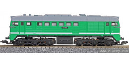 | dieselová lokomotiva zelená s bílým pruhem, šedou střechou a černým pojezdem |