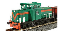 | dieselová lokomotiva zelená-oranžová s černým rámem a pojezdem |