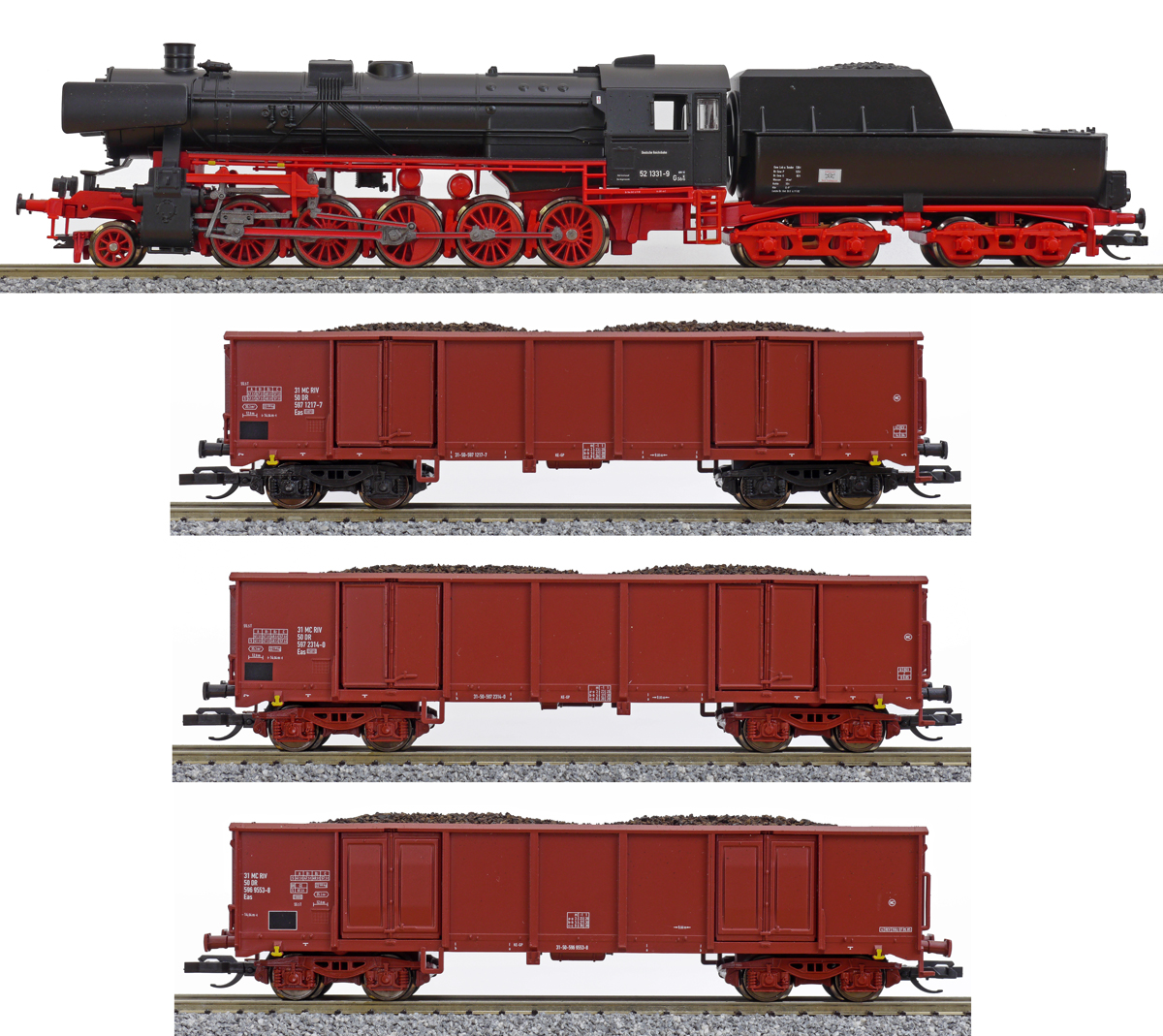 | set parní lokomotivy BR 52 a tří otevřených vysokostěnných vozů s nákladem uhlí |