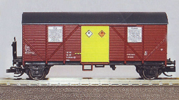 Popis   hnědý s šedou střechou a žlutými dveřmi pro přepravu nebezpečných chemikálií