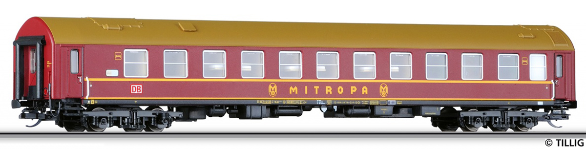 | lůžkový vůz červený s olivovou šedou střechou „MITROPA“ |