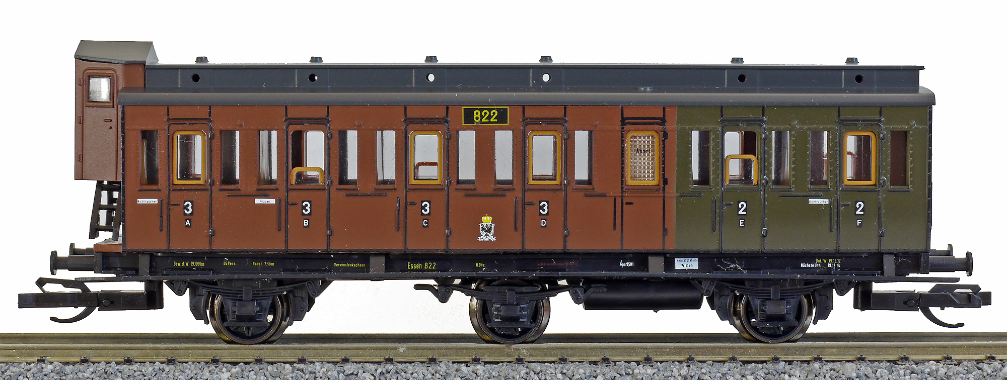 Popis   oddílový osobní vůz červenohnědý-zelený s černou střechou a brzdařskou budkou 2./3. tř.