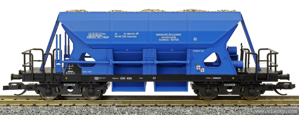 | nákladní samovýsypný vůz modrý s nákladem štěrku „Moravské železárny“ |