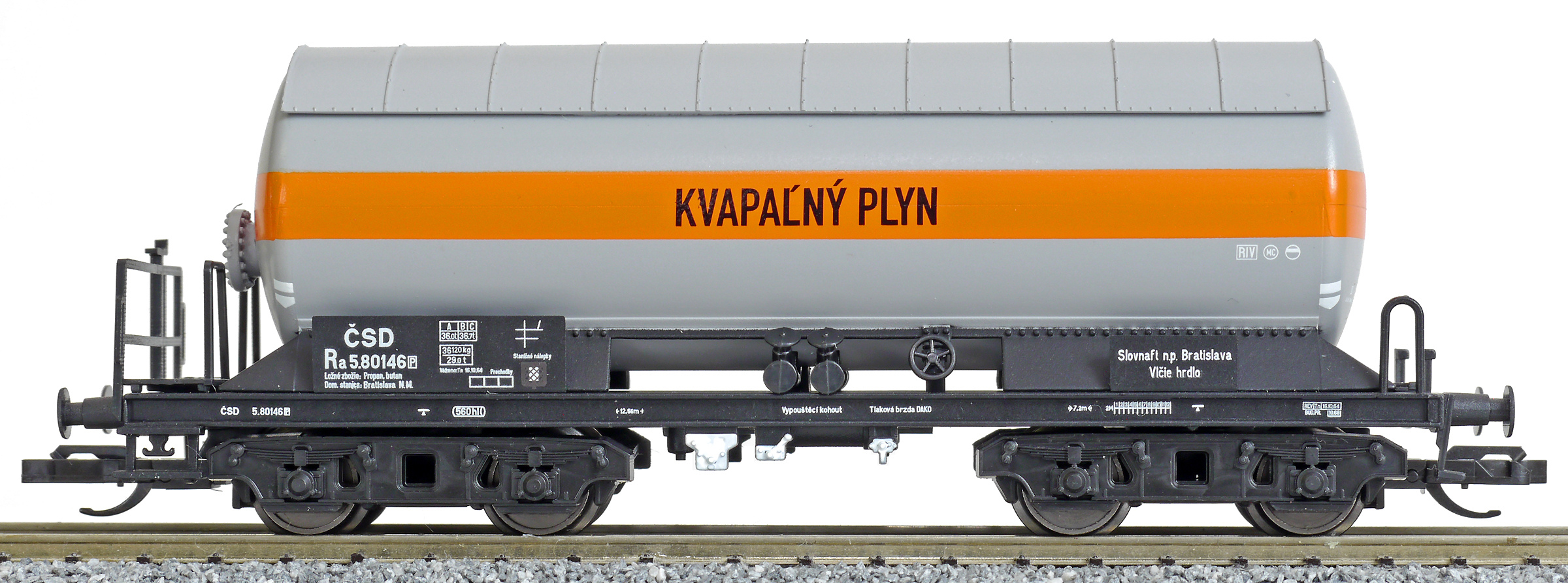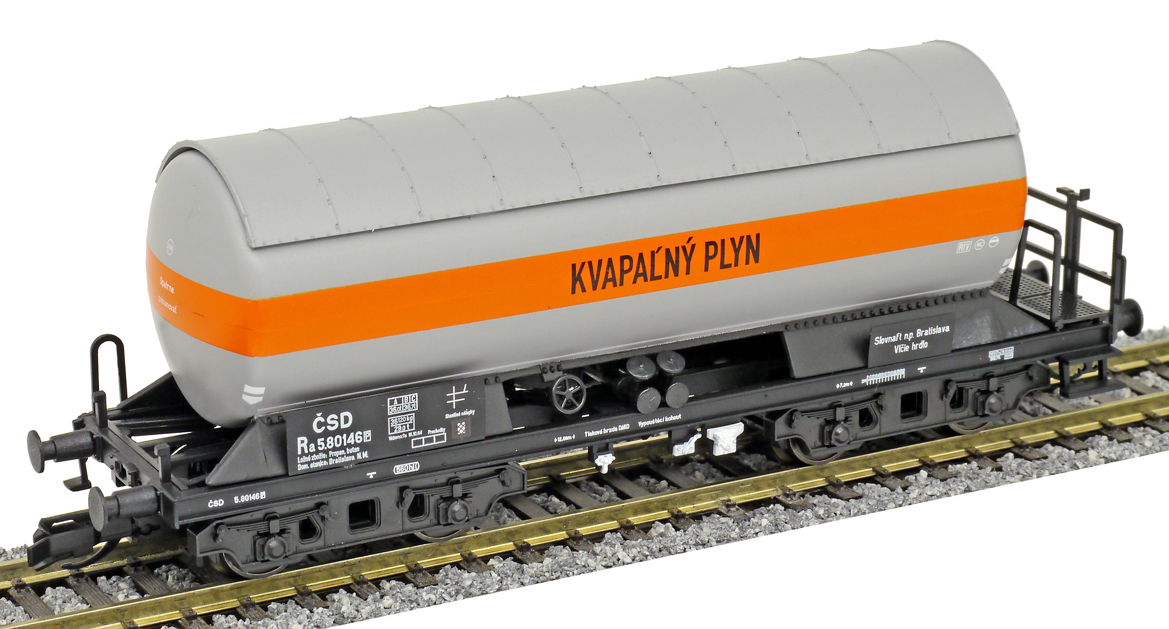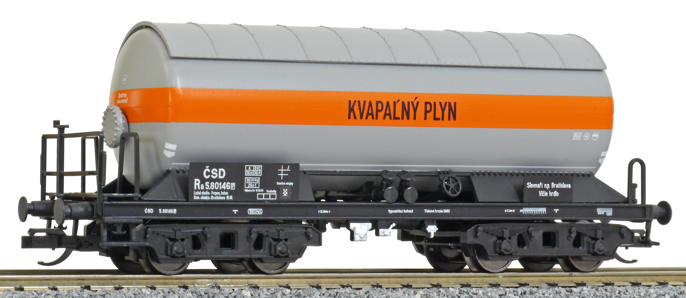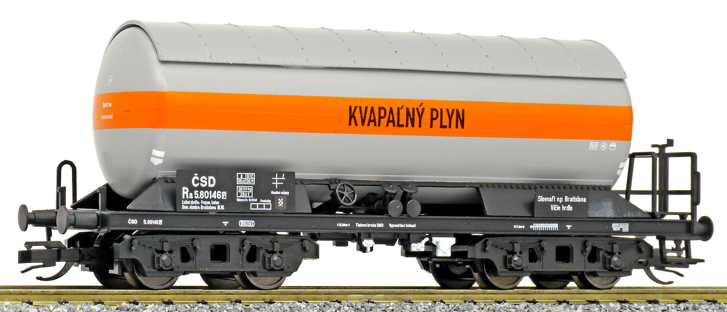 | kotlový vůz šedý s oranžovým pruhem „KVAPAĹNÝ PLYN “ |
