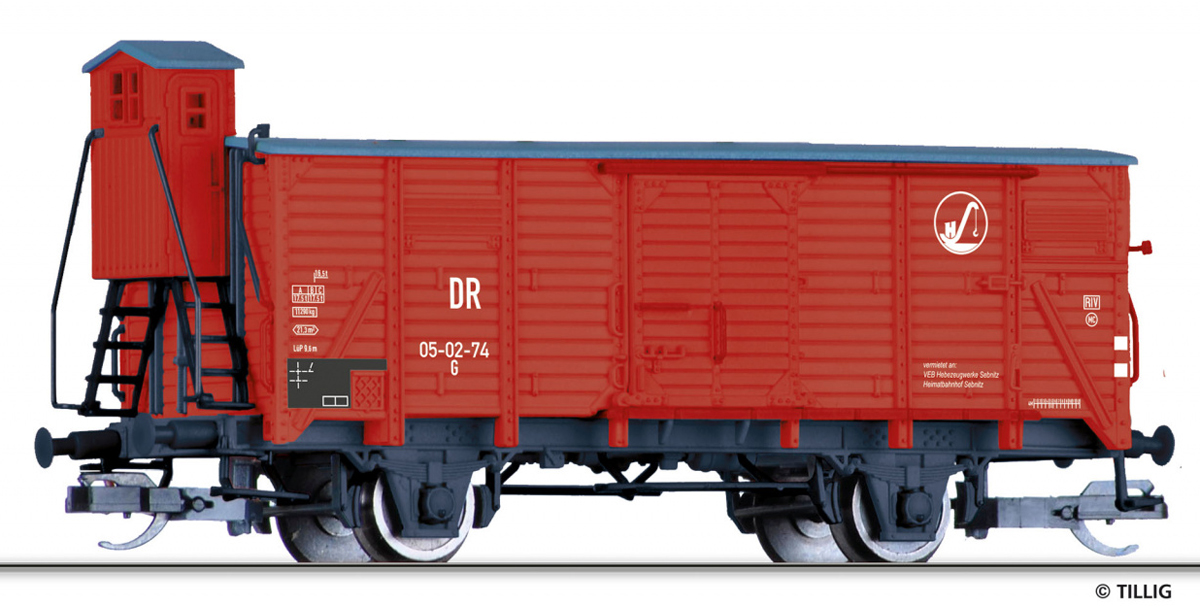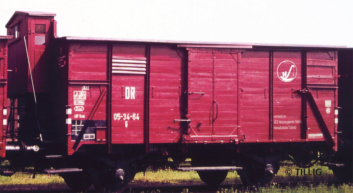 | krytý nákladní vůz červenohnědý s brzdařskou budkou „VEB Hebezeugwerk Sebnitz“ |