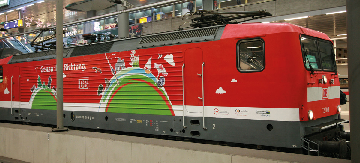 | elektrická lokomotiva červená s potiskem „Genau Ihre Richtung ...“ |