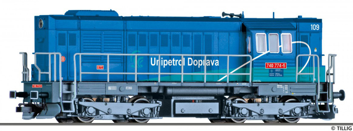 | dieselová lokomotiva v barevném schematu „Unipetrol Doprava“ |