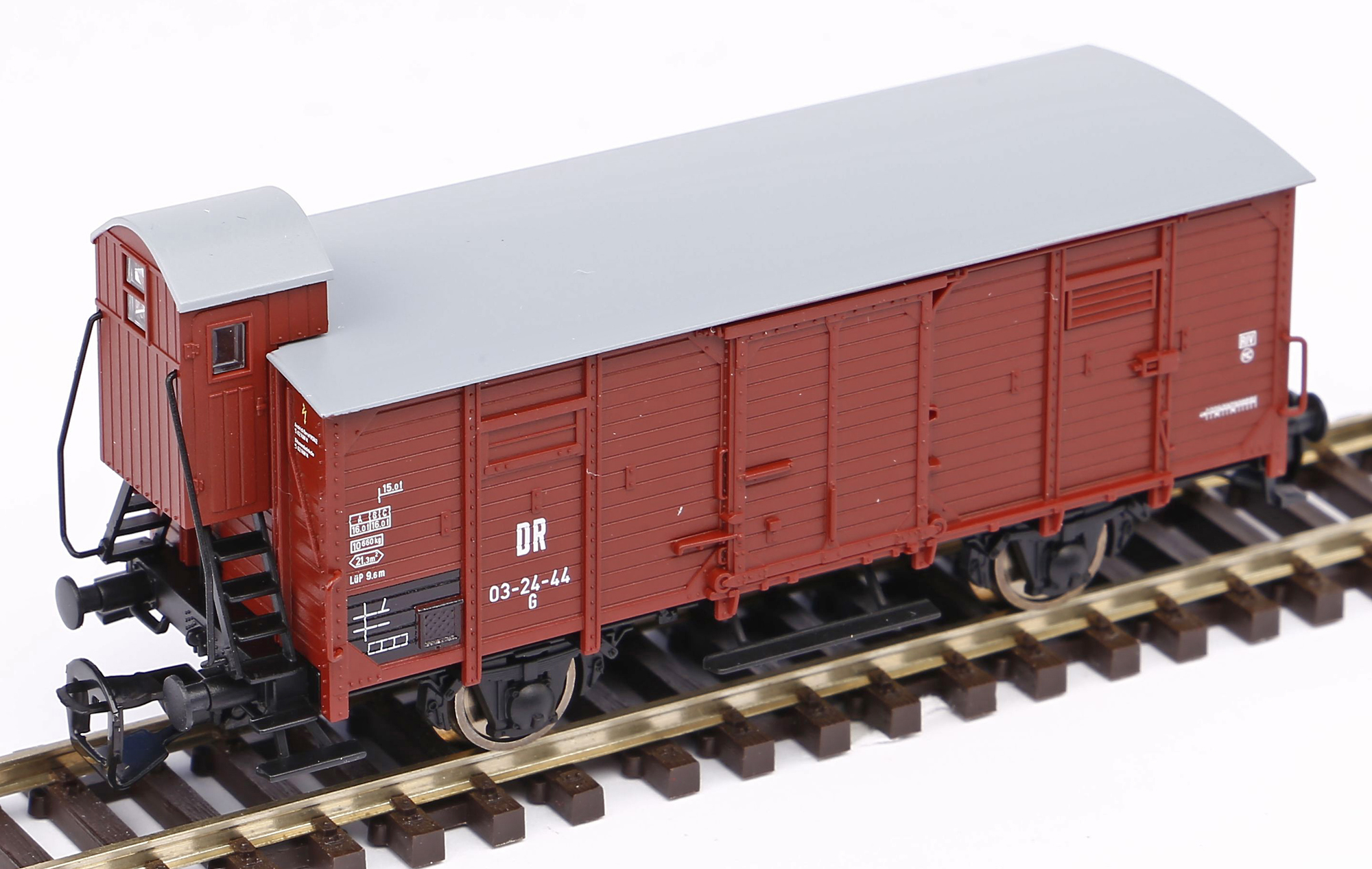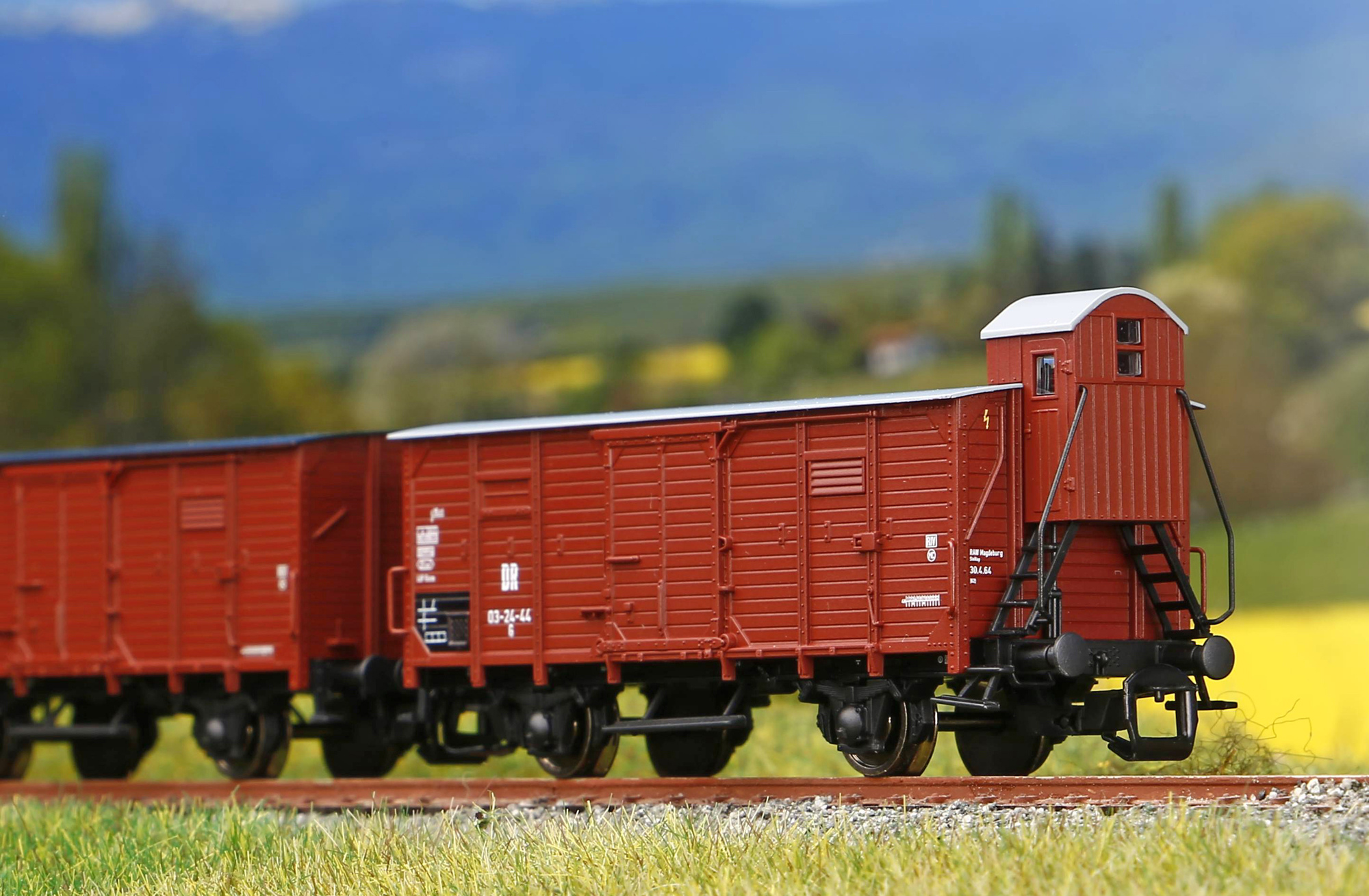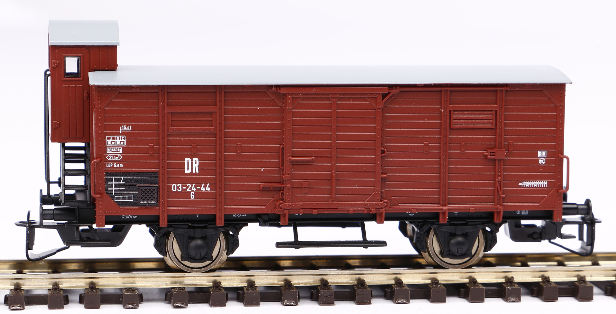 | krytý nákladní vůz červenohnědý s šedou střechou a s brzdařskou budkou |