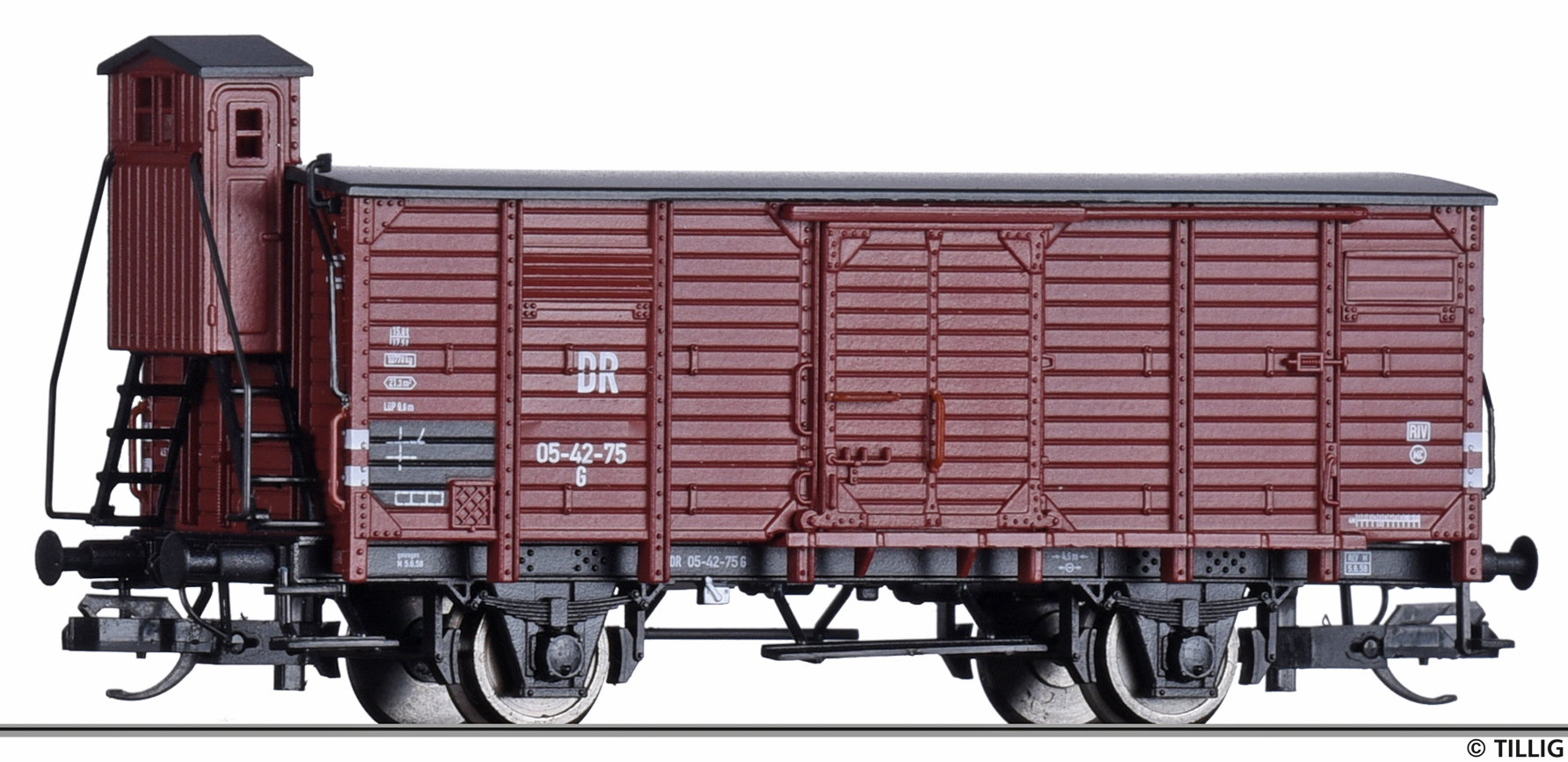 krytý nákladní vůz červenohnědý s hnědou střechou a s brzdařskou budkou