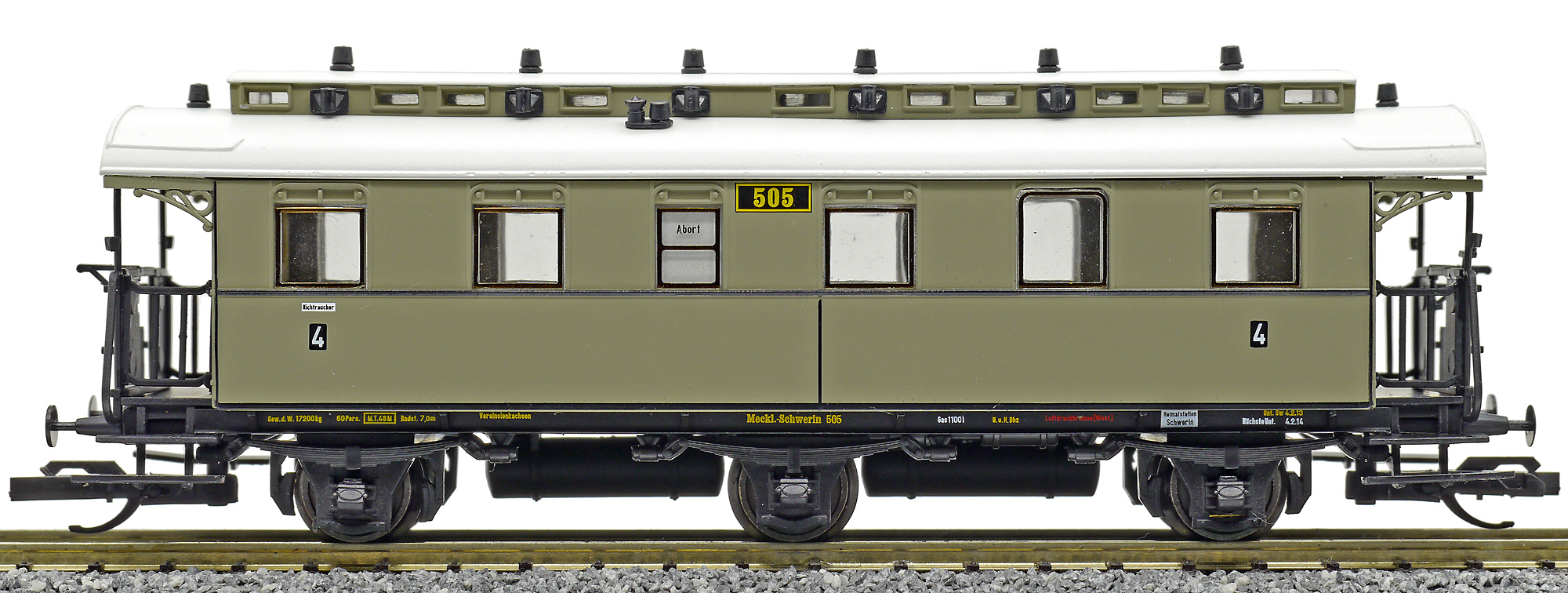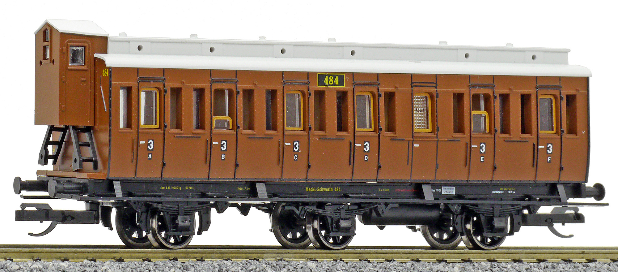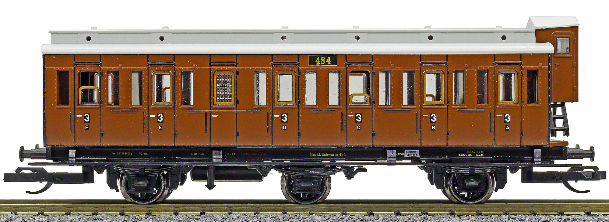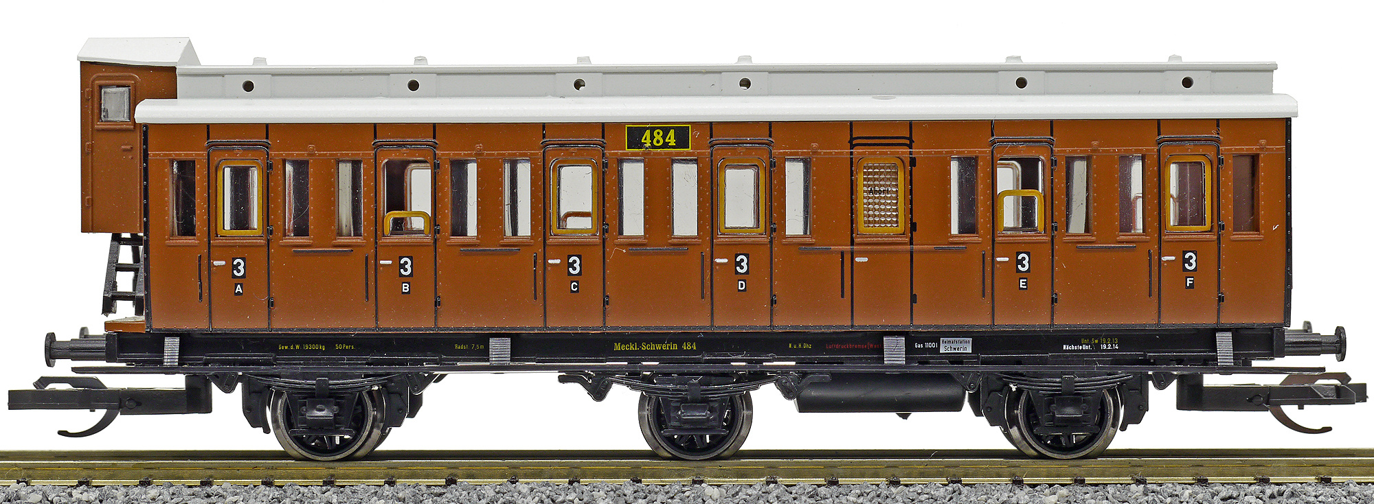 | oddílový osobní vůz červenohnědý se světle šedou střechou 3. tř. „Mecklenburgischer Reisezug 2“ |