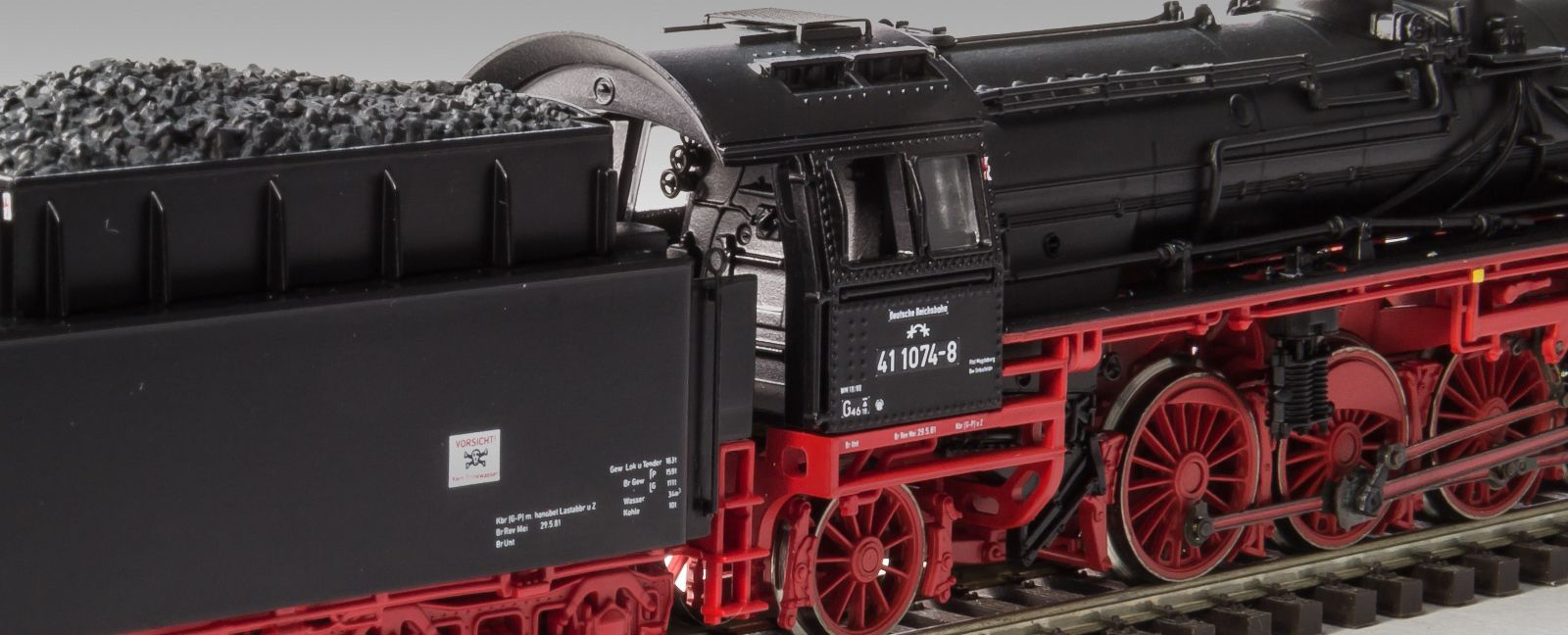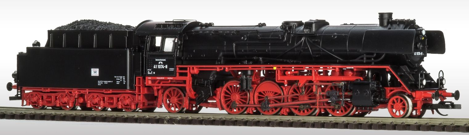 | parní lokomotiva černá s červeným pojezdem a kouřovými plechy BR 41 Reko |