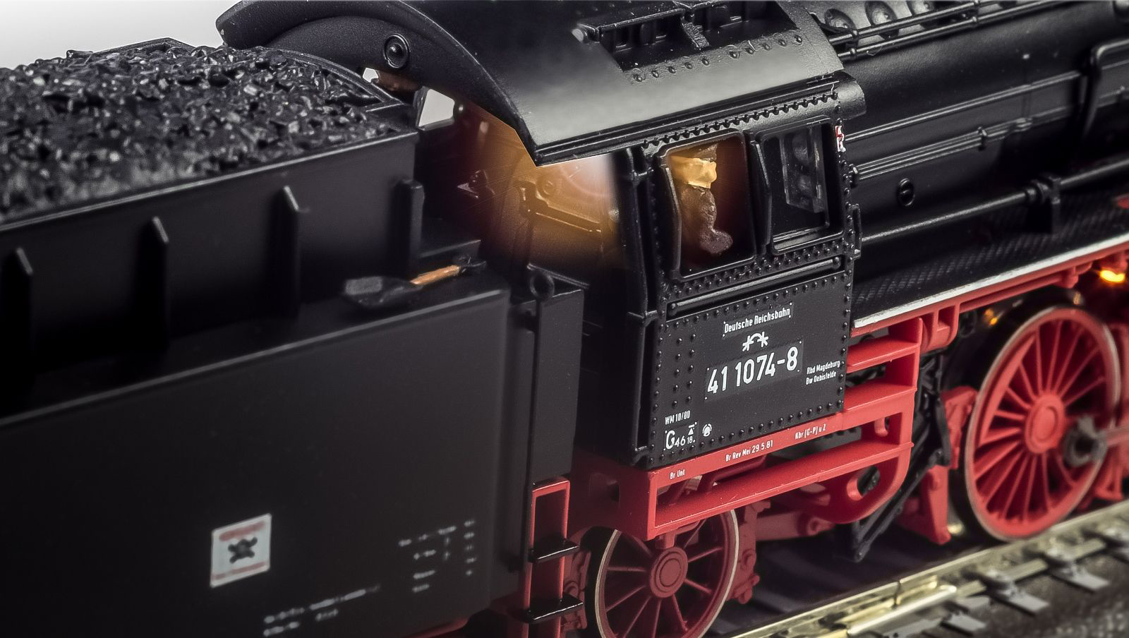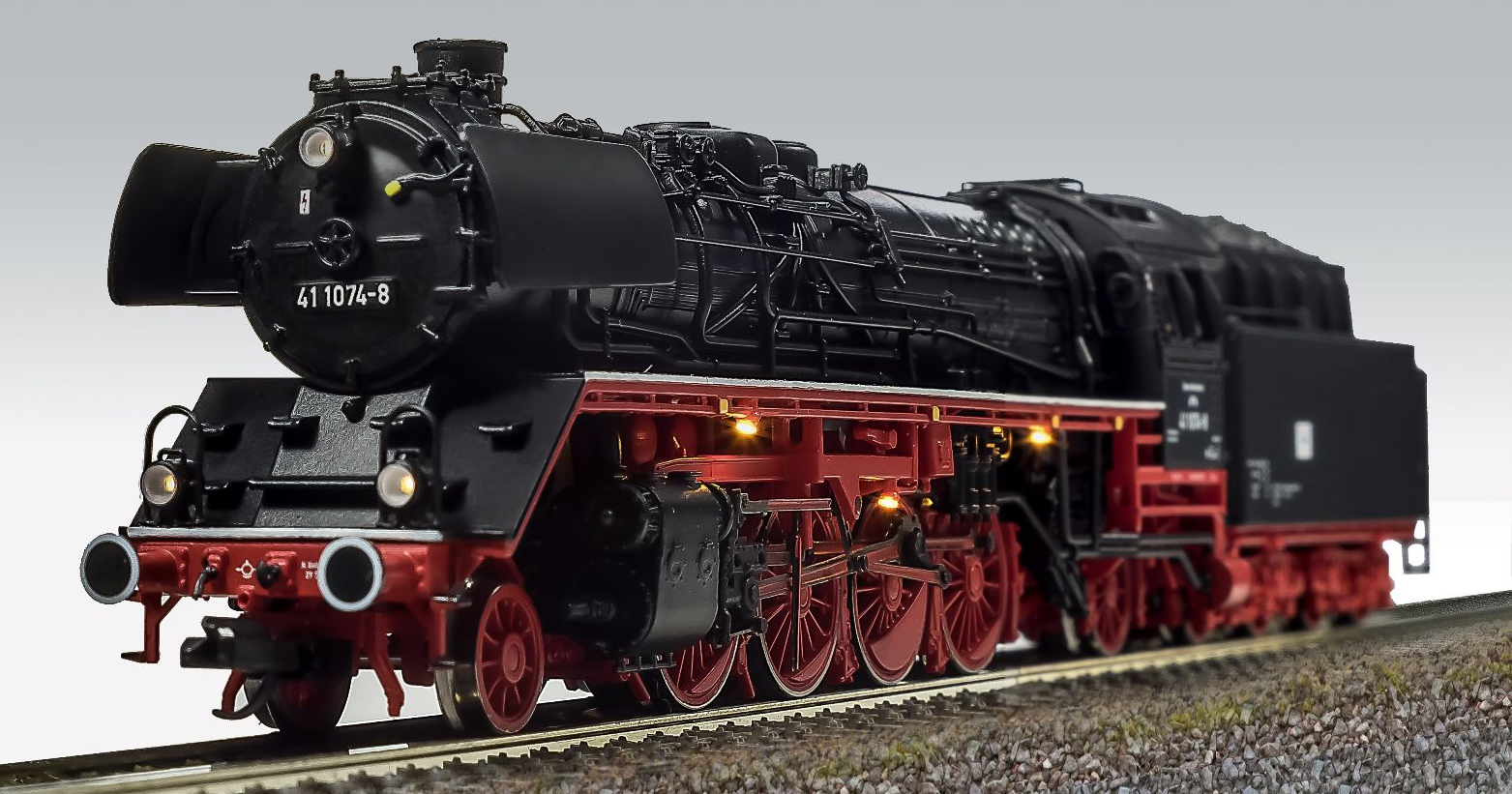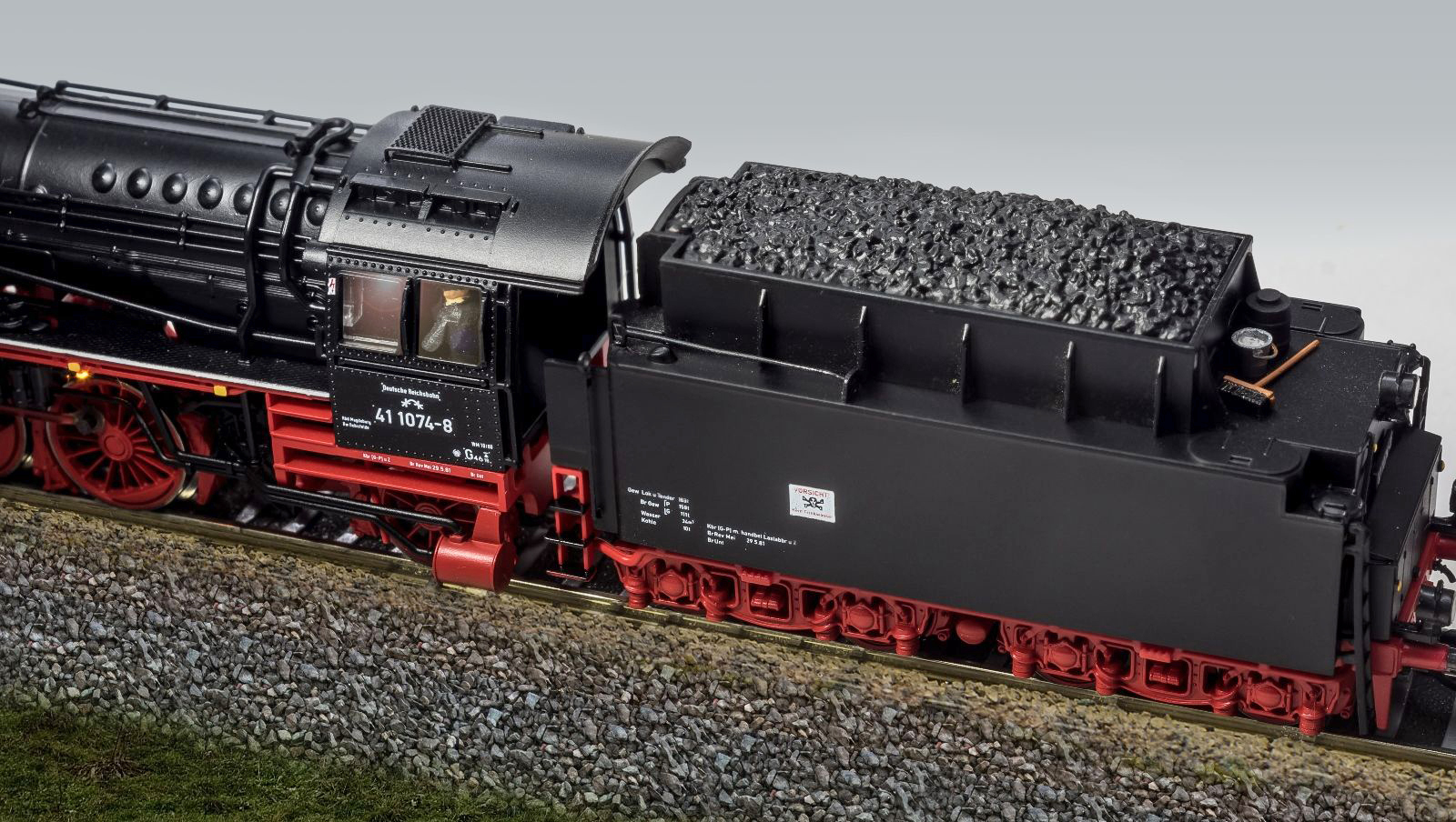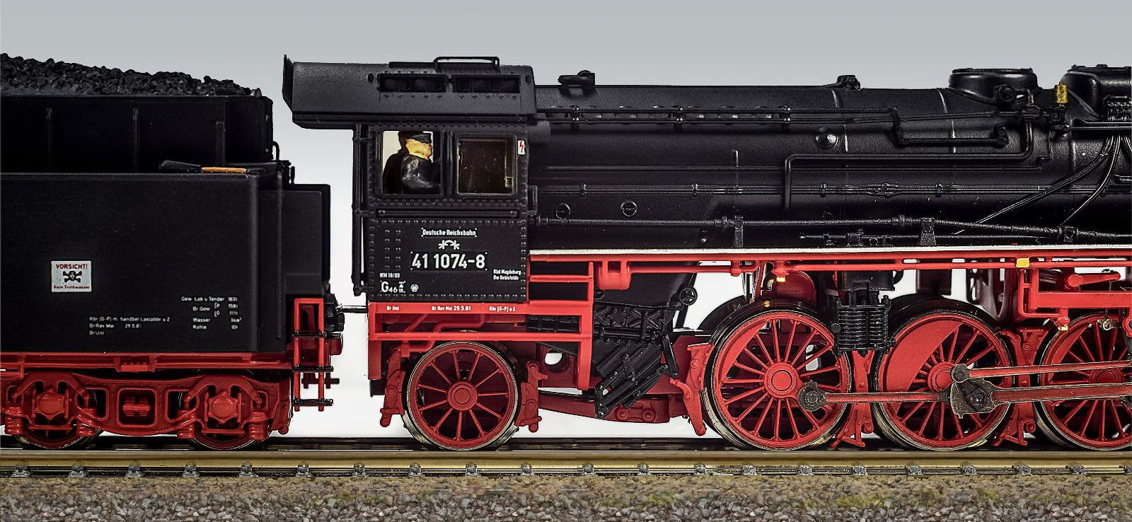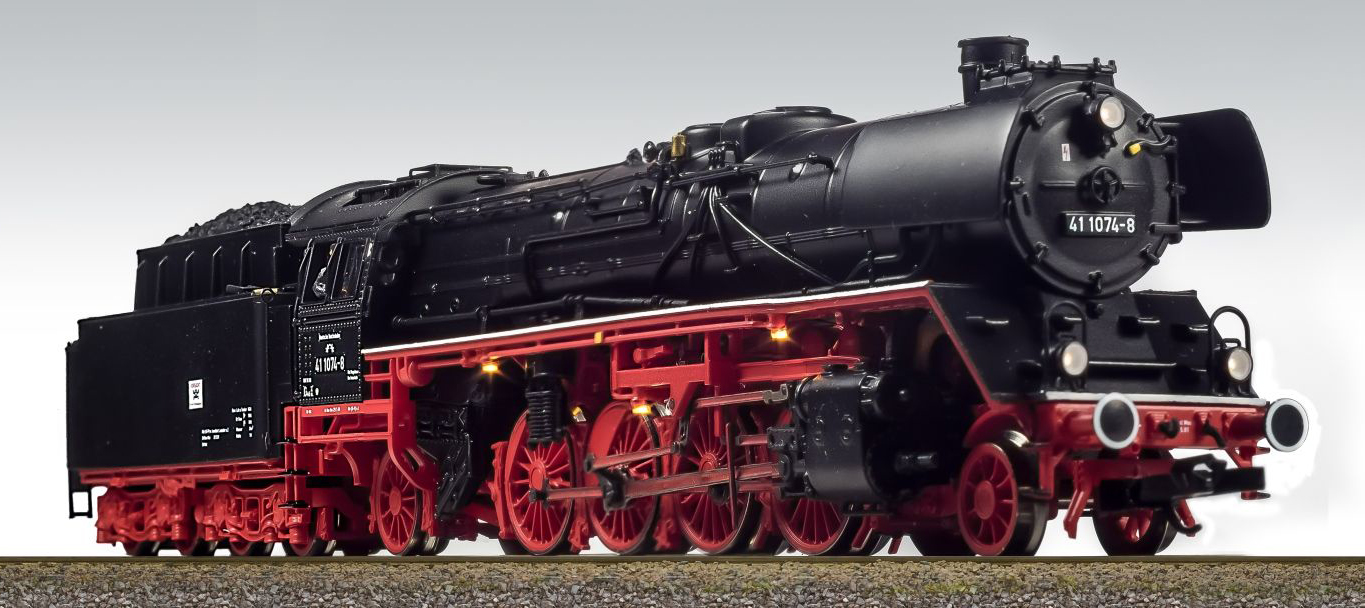 | parní lokomotiva černá s červeným pojezdem a kouřovými plechy BR 41 Reko |