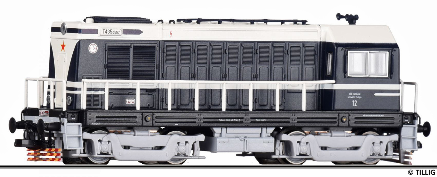 | dieselová lokomotiva tmavě modrá-slonová kost, šedý pojezd VEB Kombinat „Schwarze Pumpe“ |