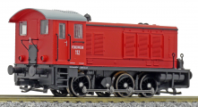 | dieselová lokomotiva červená s šedou střechou, černý rám a pojezd „Feuerlöschzu“ |