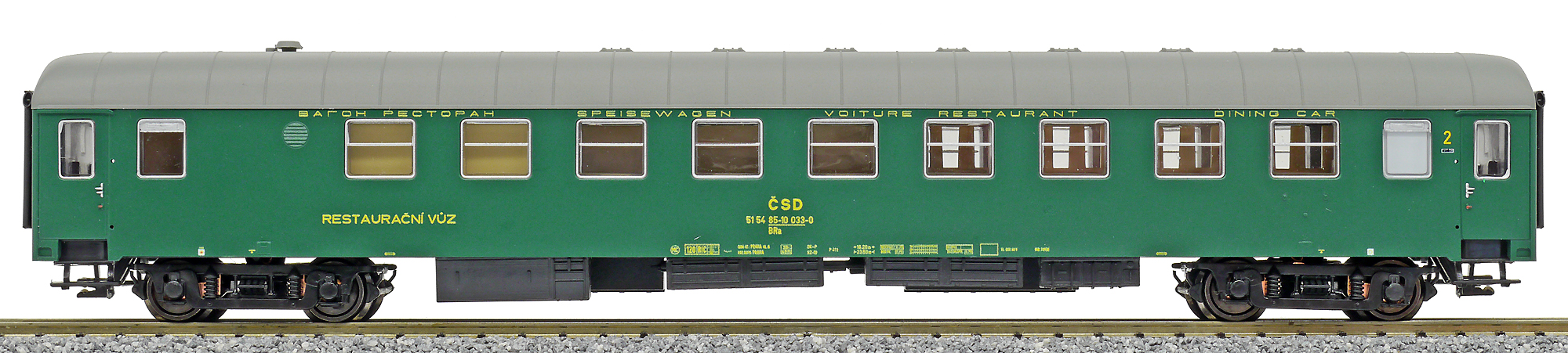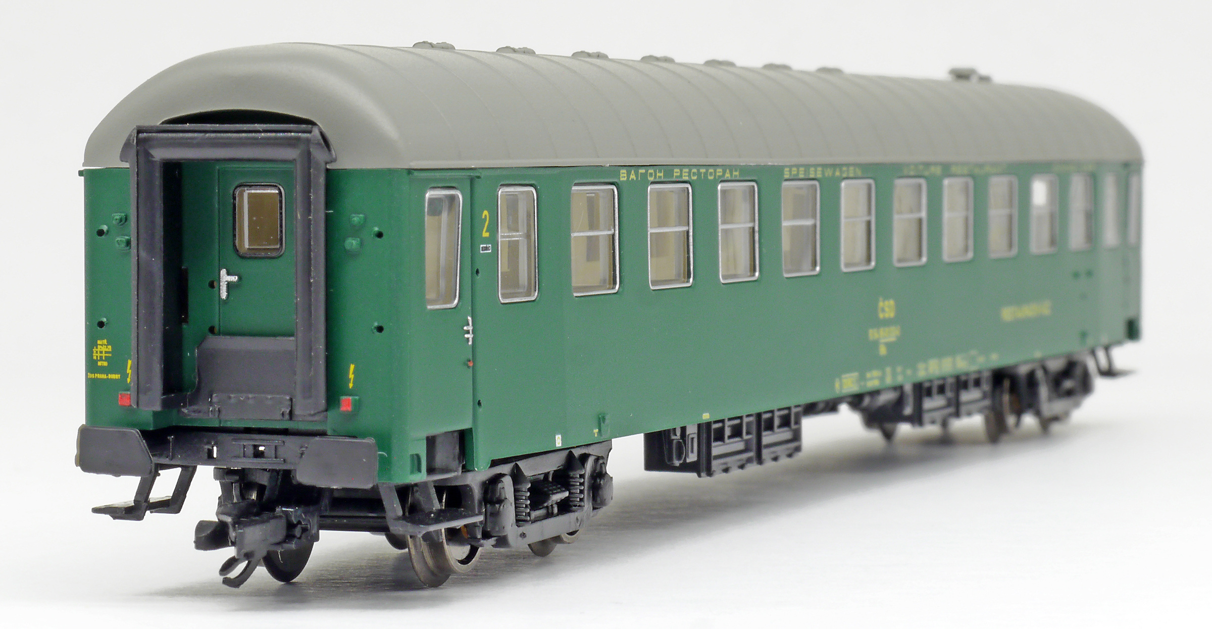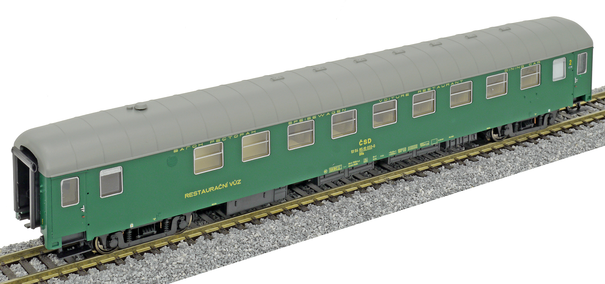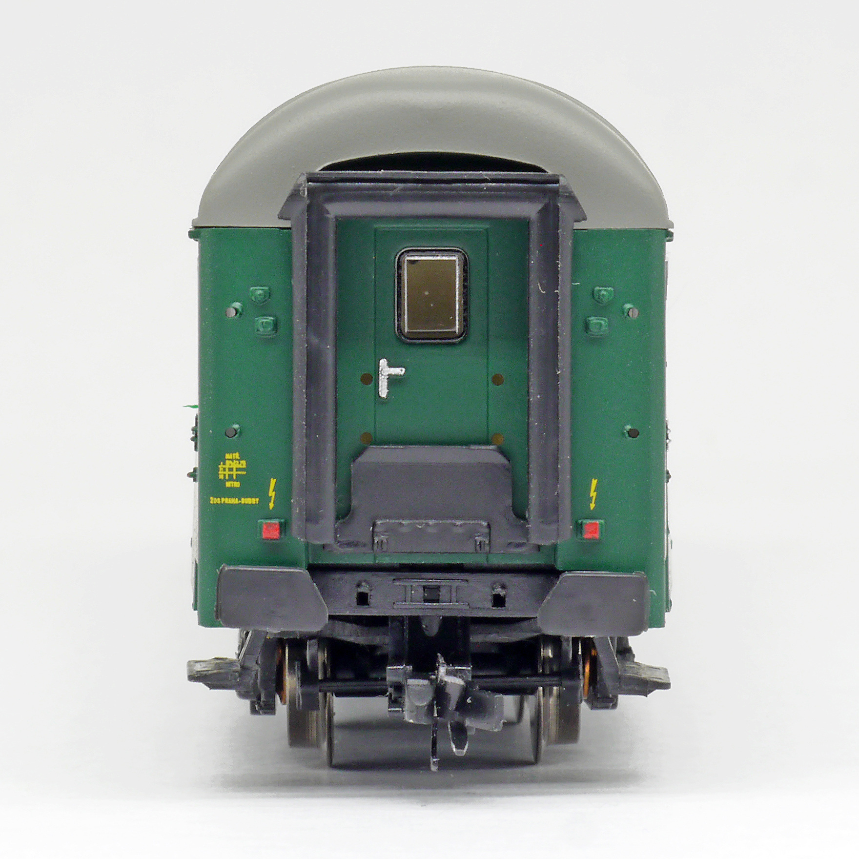 | restaurační vůz zelený s šedou střechou 2. tř., Praha |